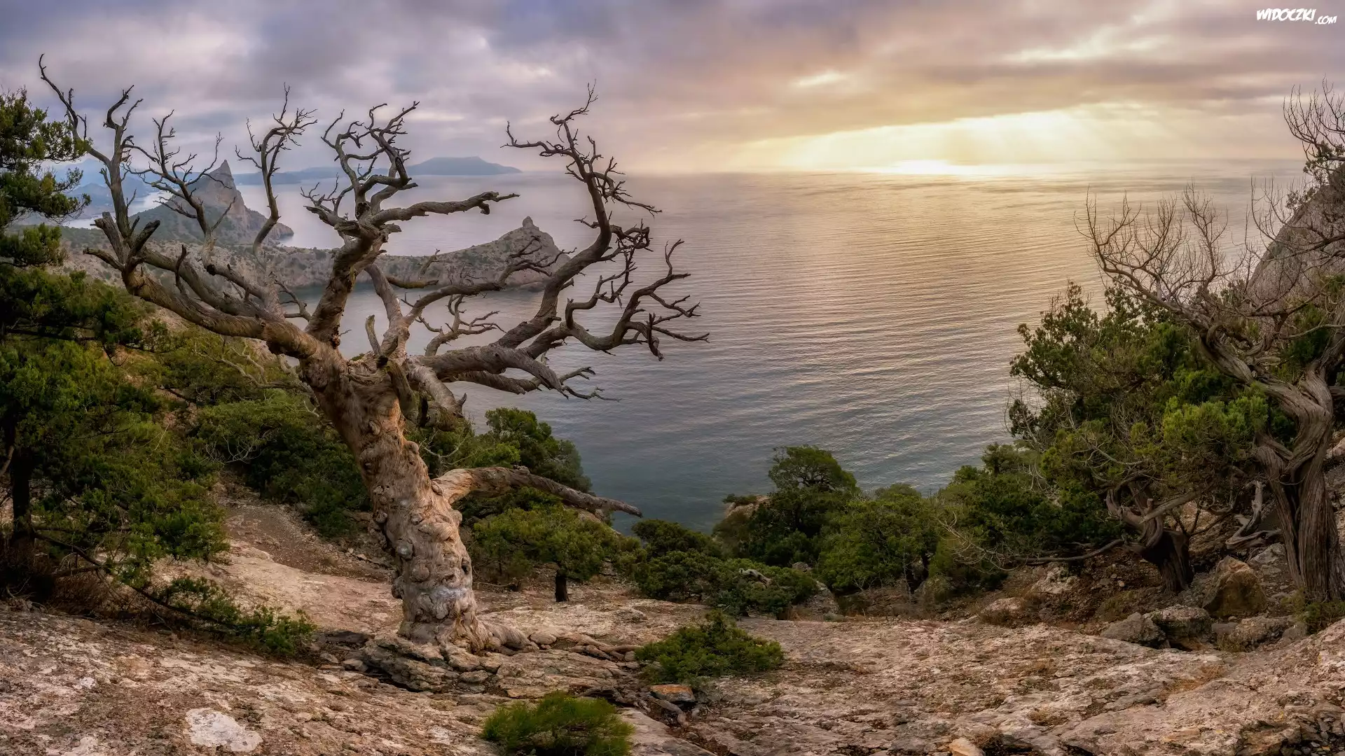 Zdjęcia, Morze, Skały, Drzewa, Wschód słońca, Wybrzeże
