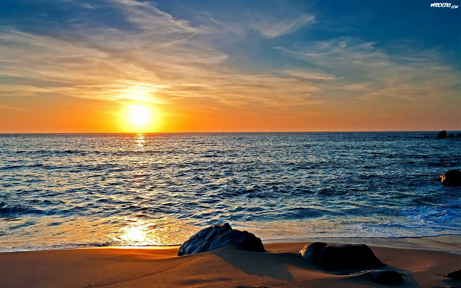 Morze, Plaża, Głazy, Zachód, Słońca, Chmury