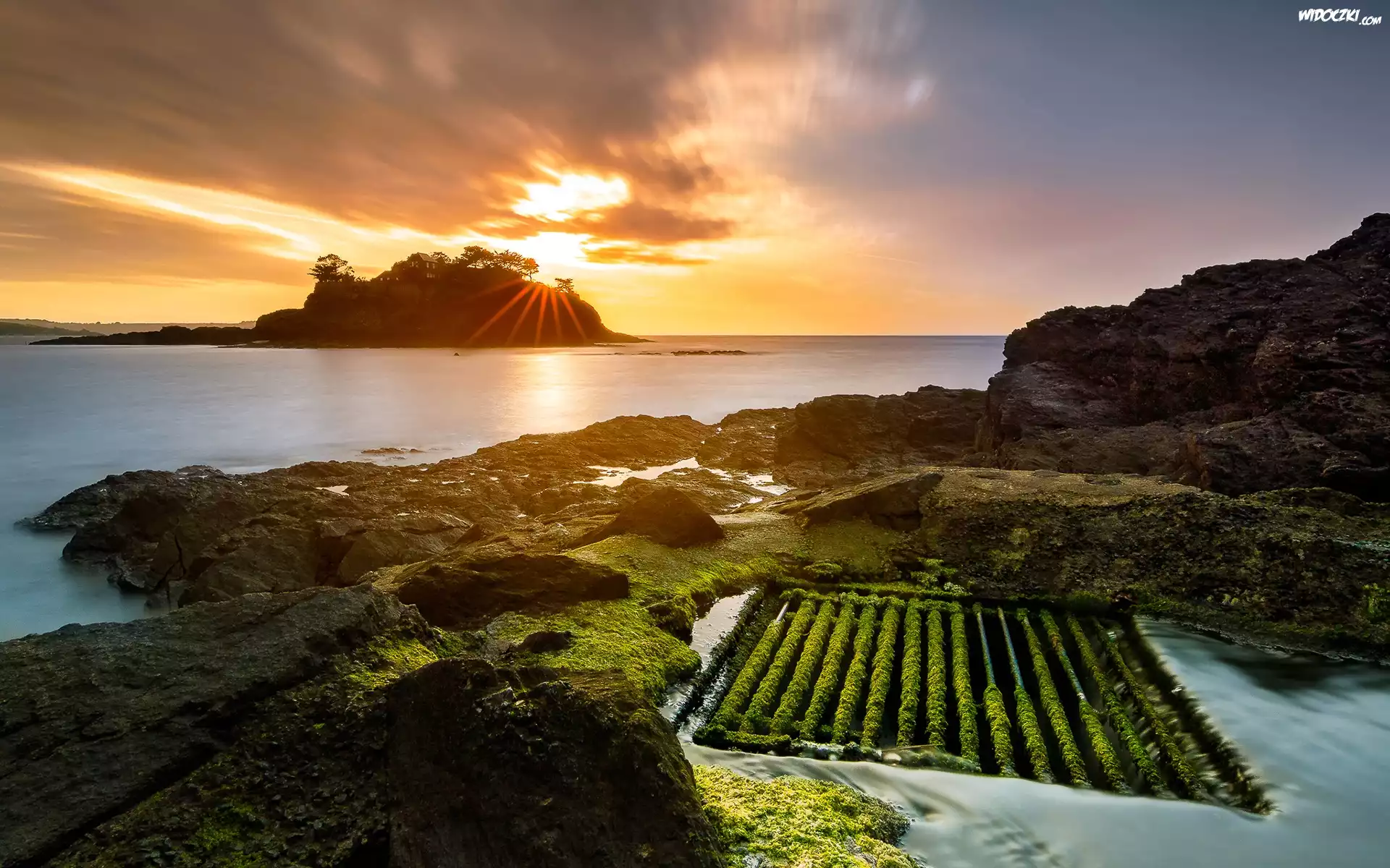 Zdjęcia, Morze, Skały, Mech, Zachód słońca, Wyspa