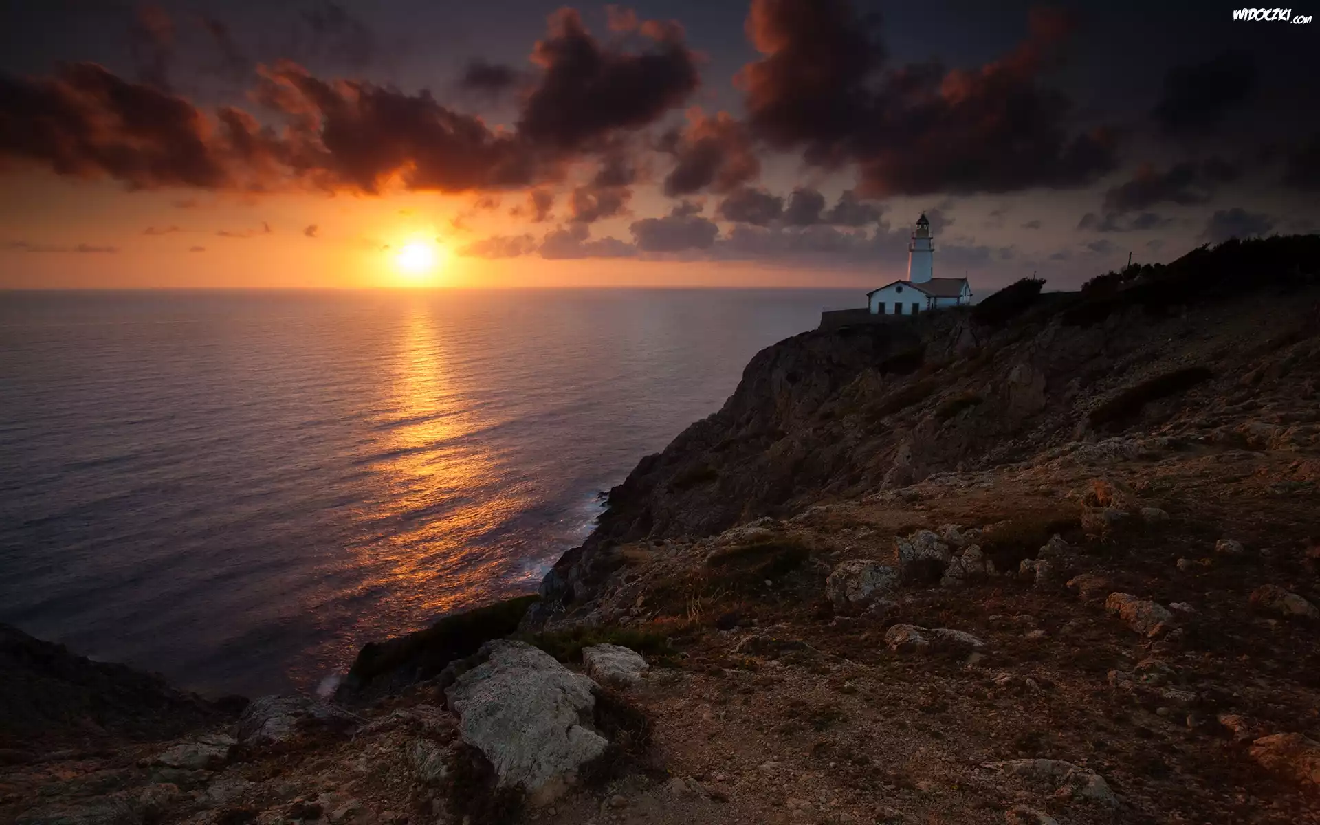 Zdjęcia, Morze, Latarnia morska , Zachód słońca, Kamienie