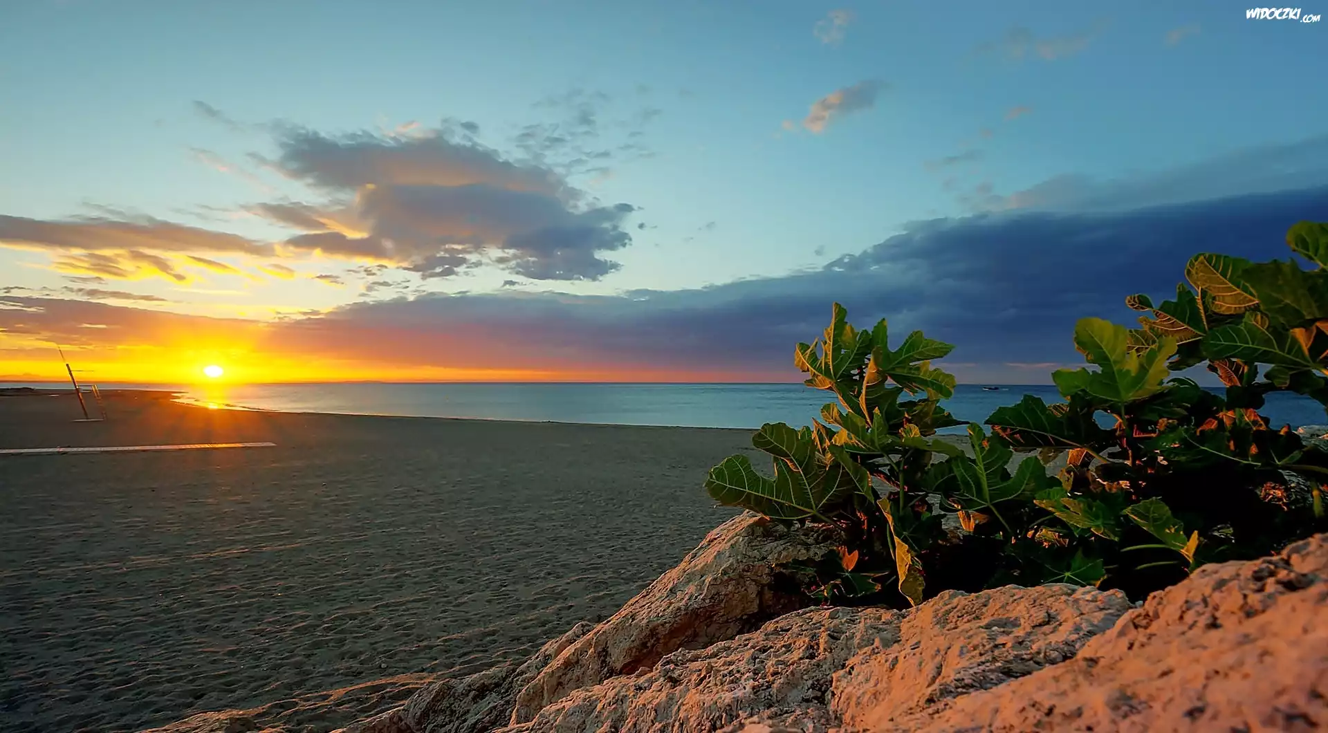 Zdjęcia, Morze, Plaża, Niebo, Zachód, Słońca, Rośliny