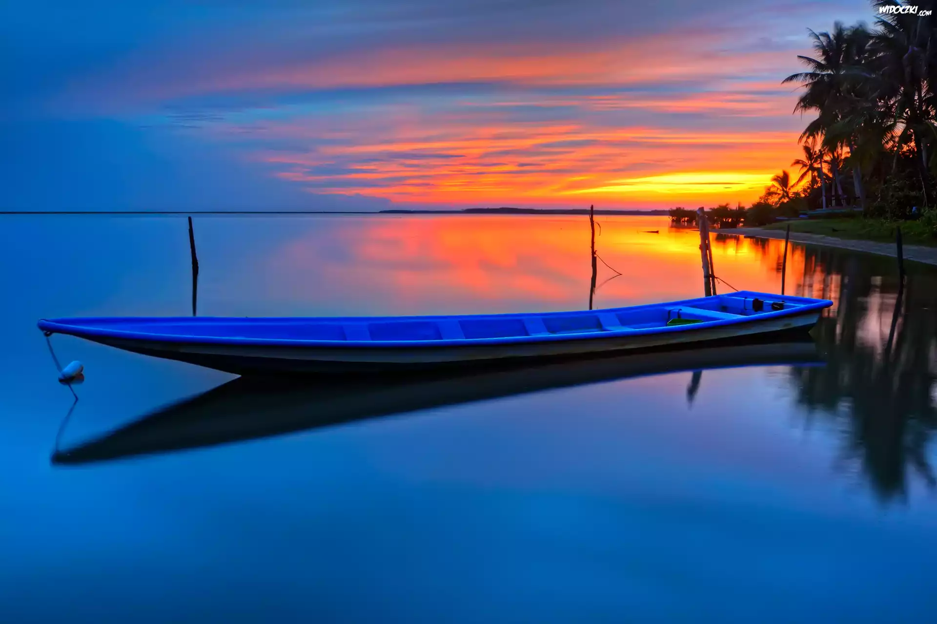 Morze, Łódz, Palmy, Zachód, Słońca, Tropiki