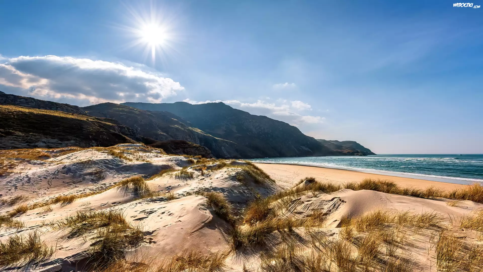Morze, Wybrzeże, Promienie słońca, Wydmy, Plaża, Maghera Ardara Co Donegal, Hrabstwo Donegal, Irlandia |