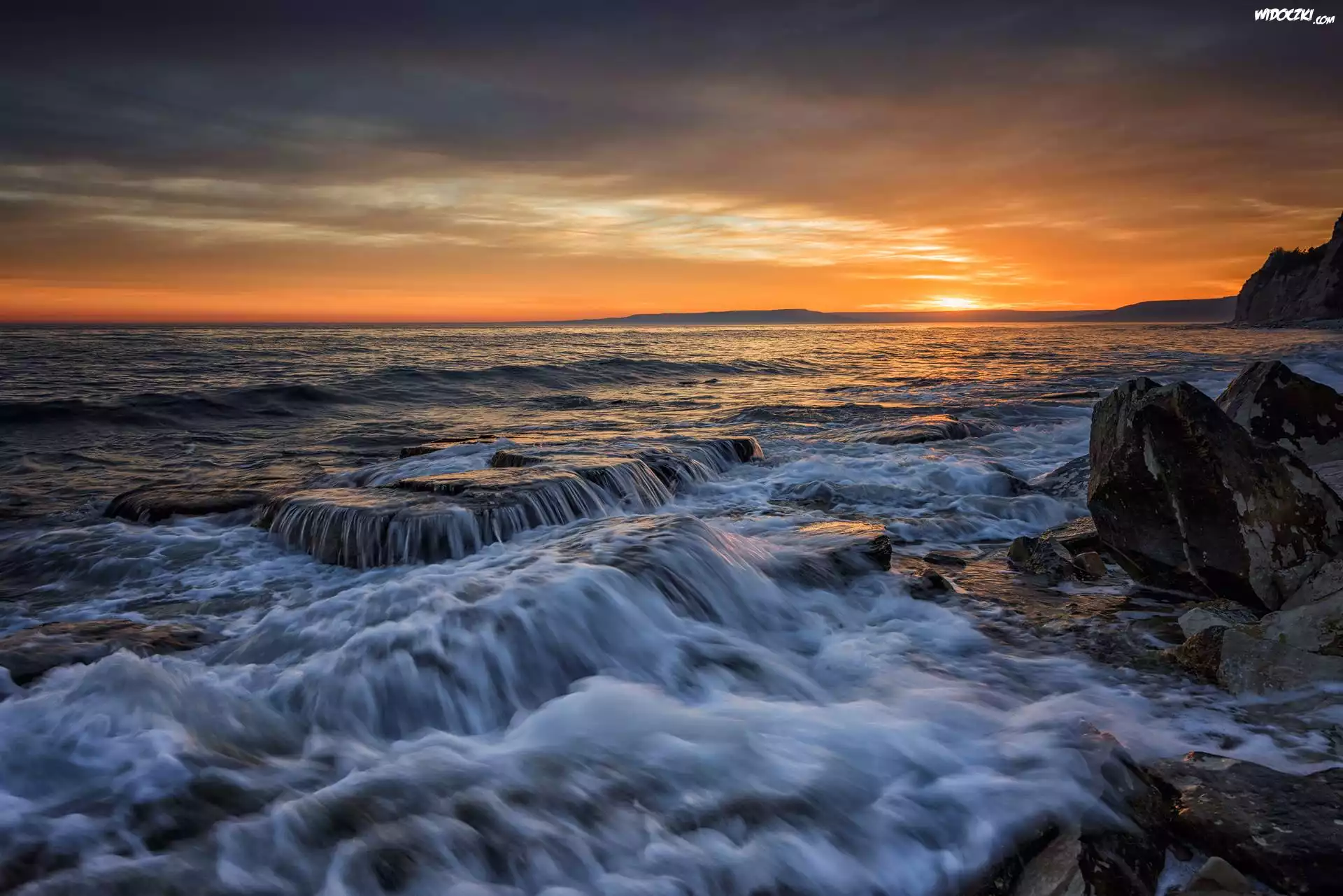 Zdjęcia, Morze, Fale, Skały, Zachód słońca, Chmury