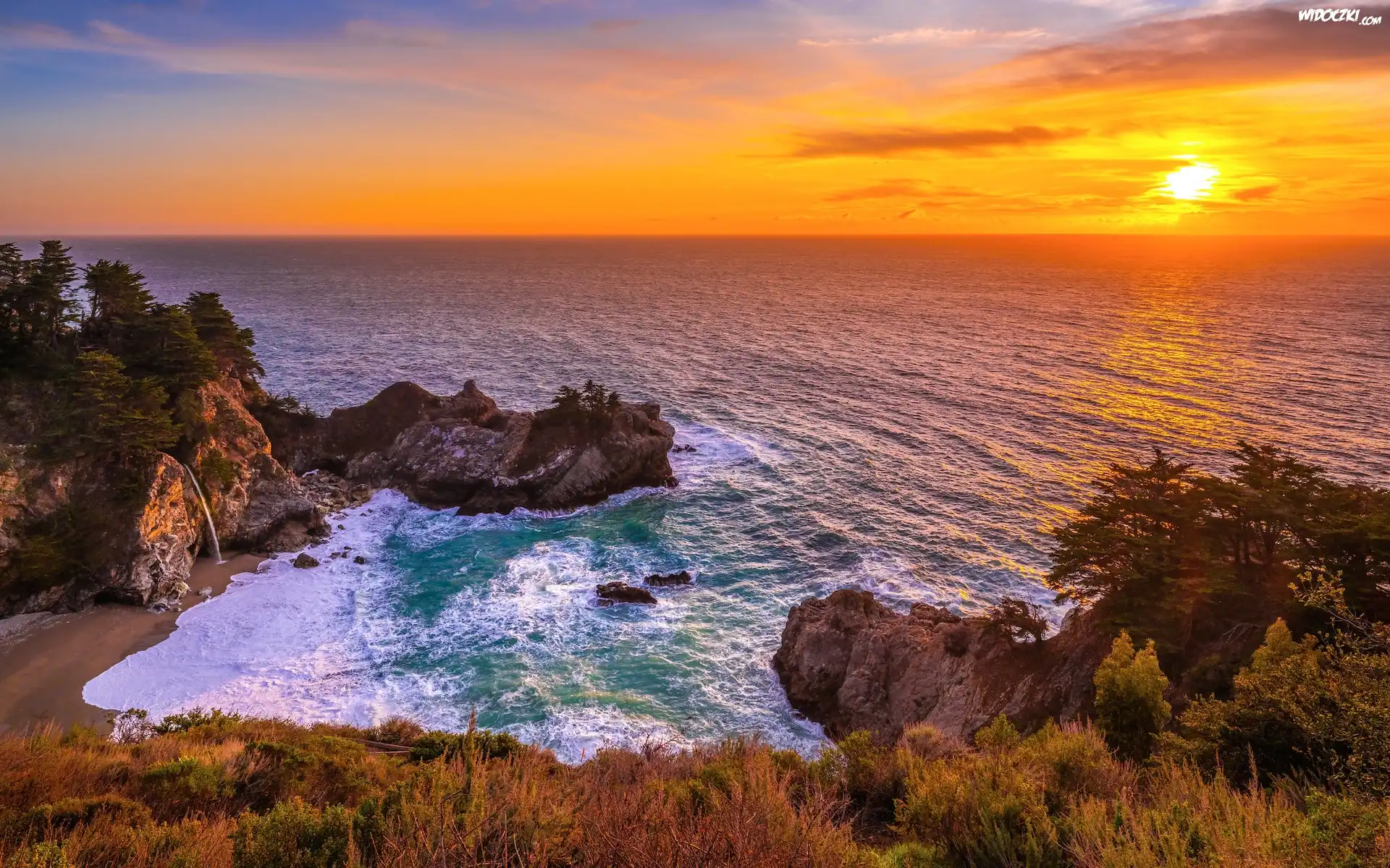 Morze, Wybrzeże Big Sur, Skały, Zachód słońca, Plaża, Zatoka McWay Cove, Park Stanowy Julia Pfeiffer Burns, Kalifornia, Stany Zjednoczone |