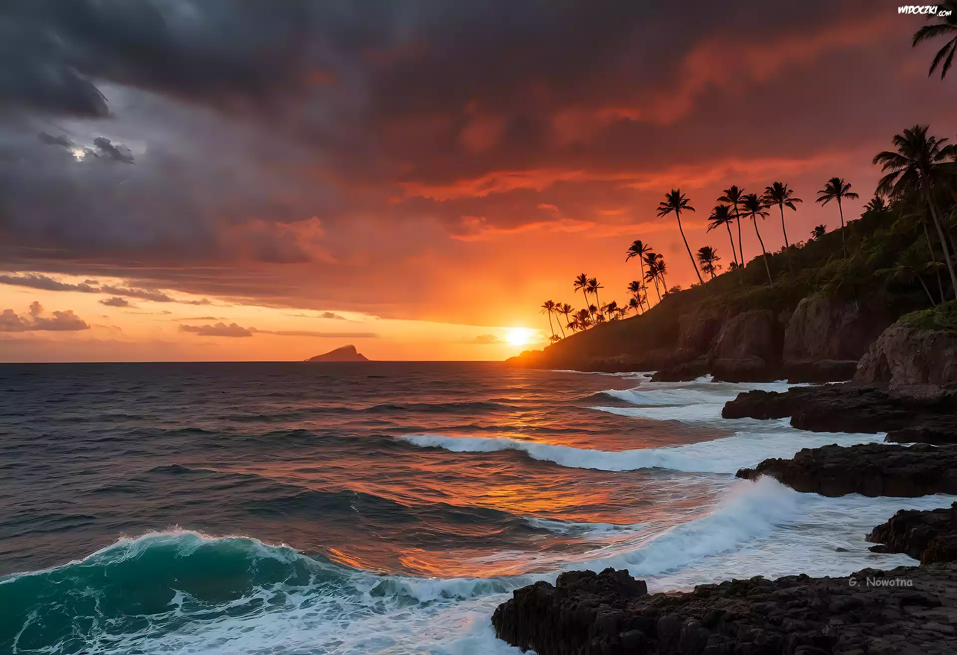 Zdjęcia, Klif, Palmy, Wyspa, Morze, Zachód Słońca