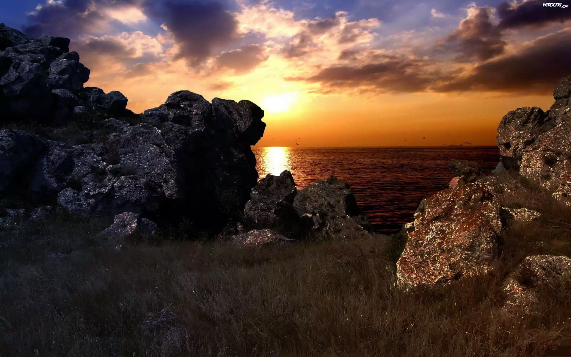 Morze, Zachód, Słońca, Chmury