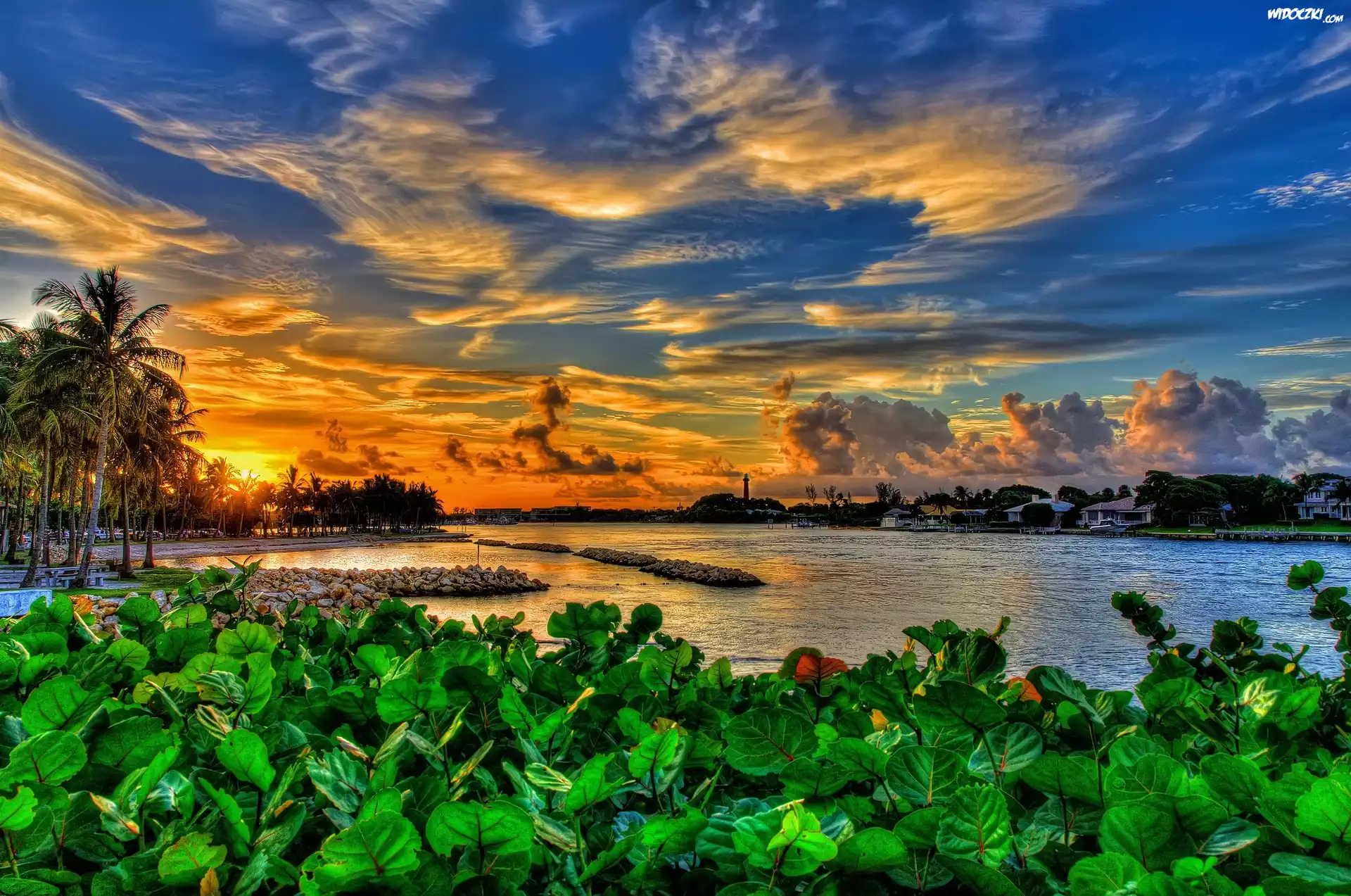 Zdjęcia, Morze, Chmury, Zachód Słońca, Zieleń