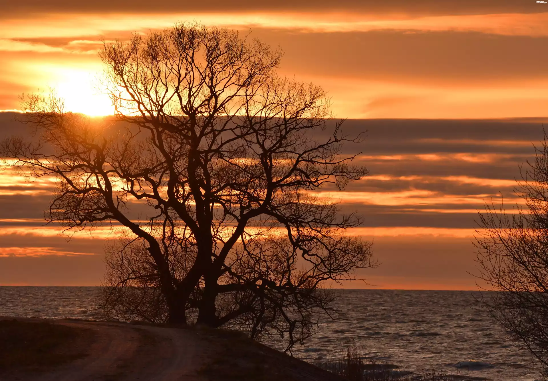 Morze, Zachód słońca, Drzewo
