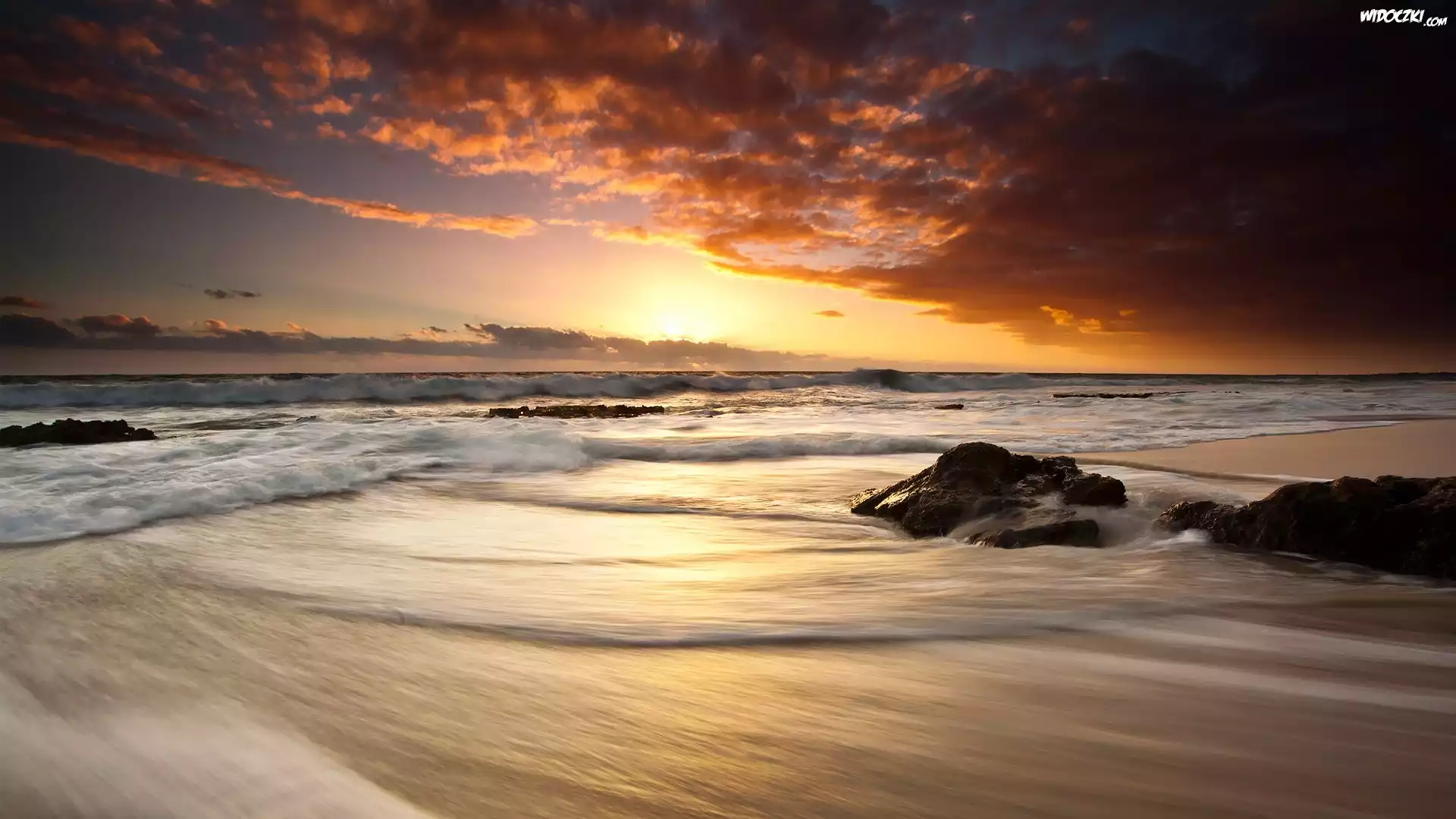 Zdjęcia, Morze, Fale, Zachód słońca, Chmury