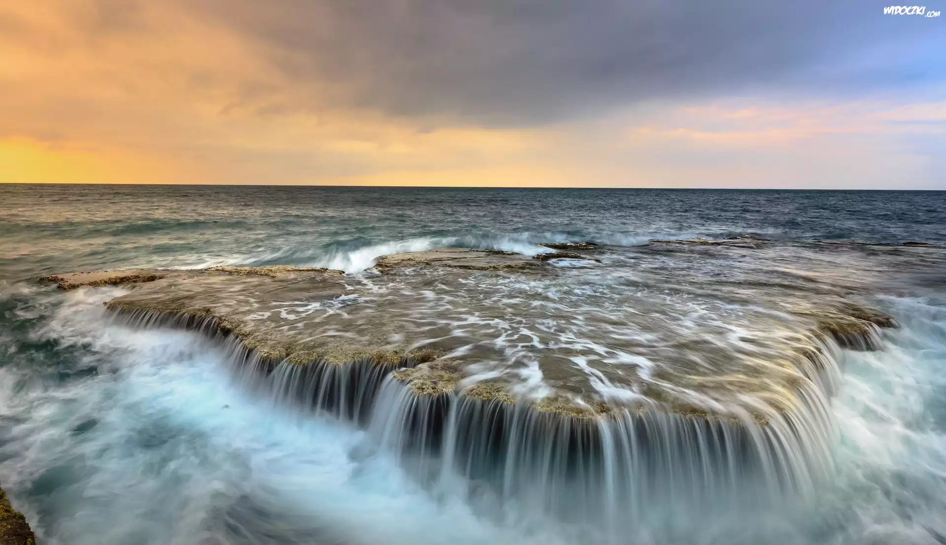 Zdjęcia, Morze, Fale, Zachód słońca, Skała