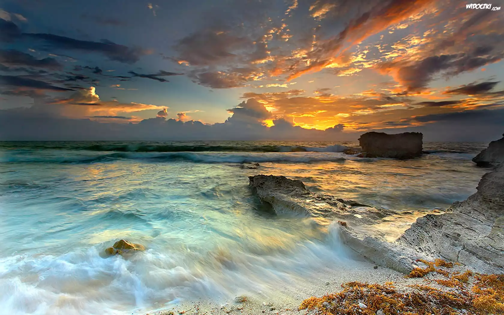 Zdjęcia, Morze, Fale, Zachód, Słońca, Skały
