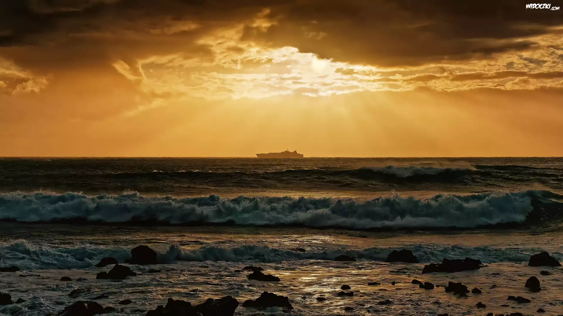 Zdjęcia, Morze, Fale, Zachód słońca, Statek