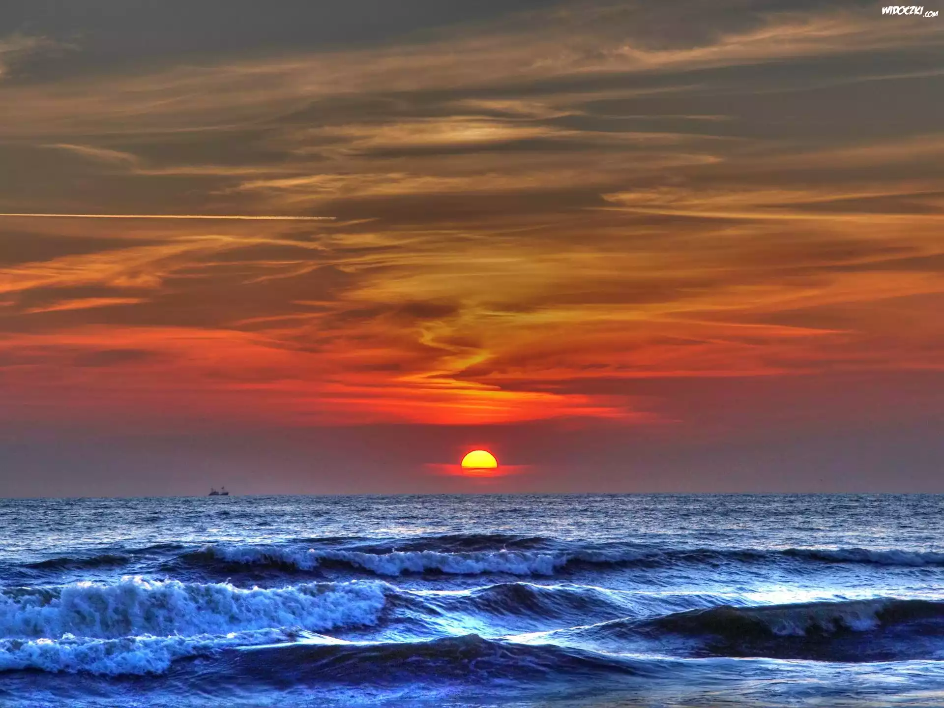 Zdjęcia, Morze, Zachód, Słońca, Fale