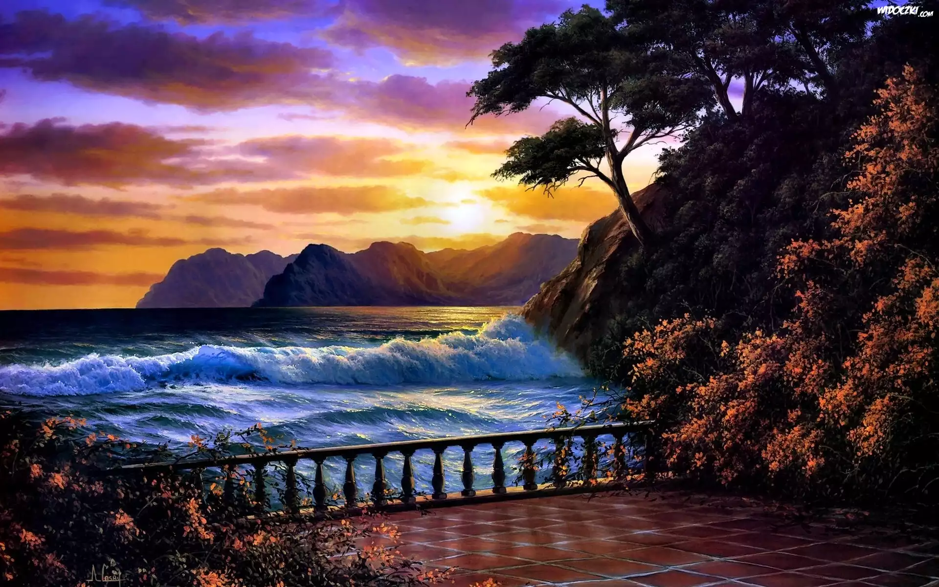 Zdjęcia, Morze, Góry, Zachód Słońca, Taras