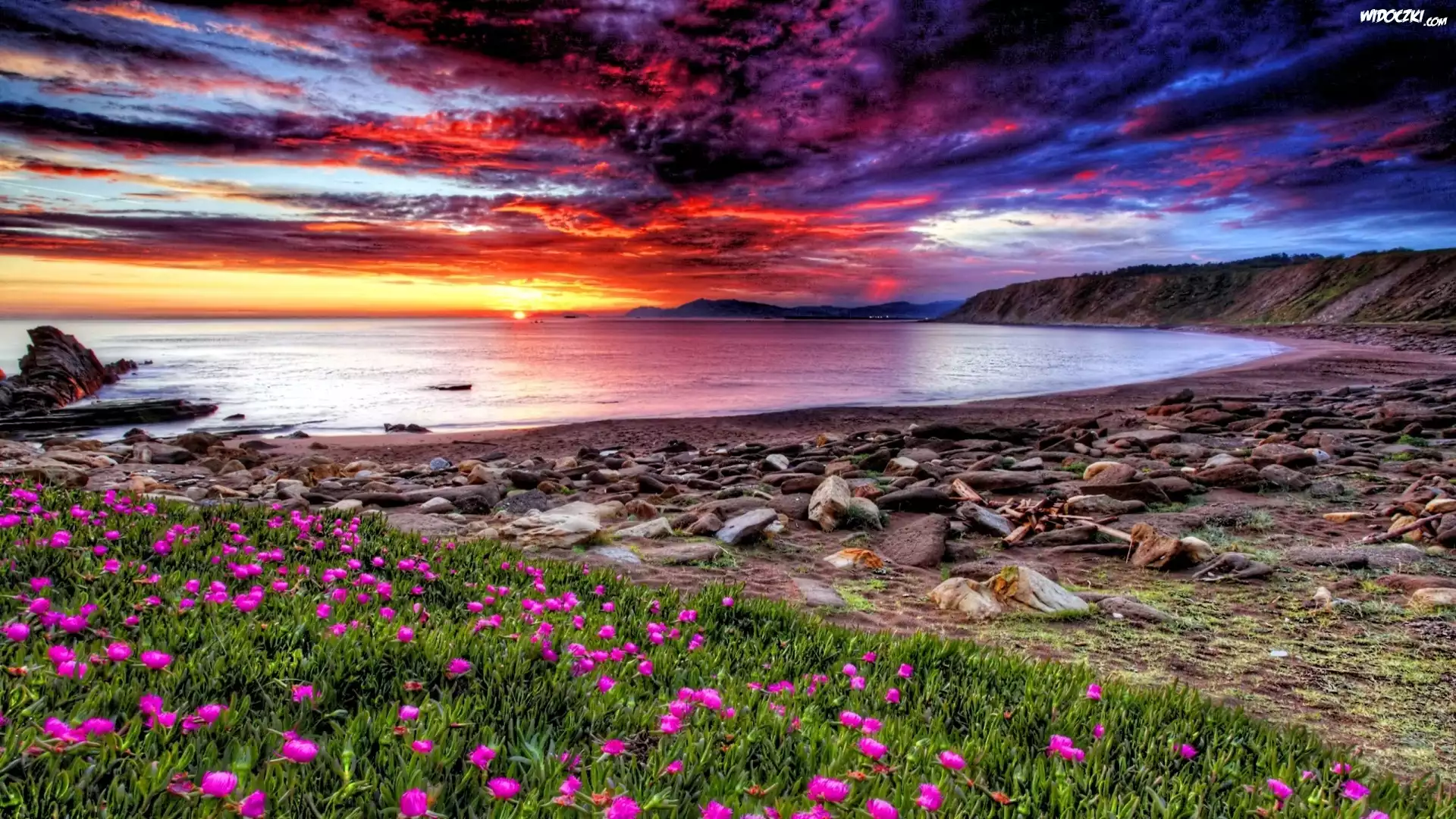 Zdjęcia, Morze, Kamienie, Zachód Słońca, Kwiatki