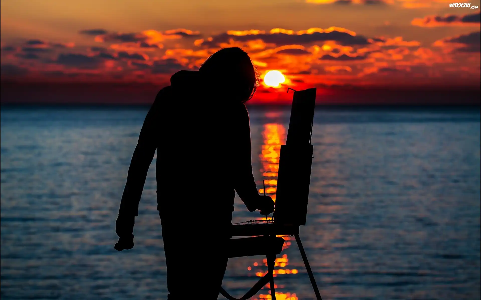 Zdjęcia, Morze, Zachód, Słońca, Malarz