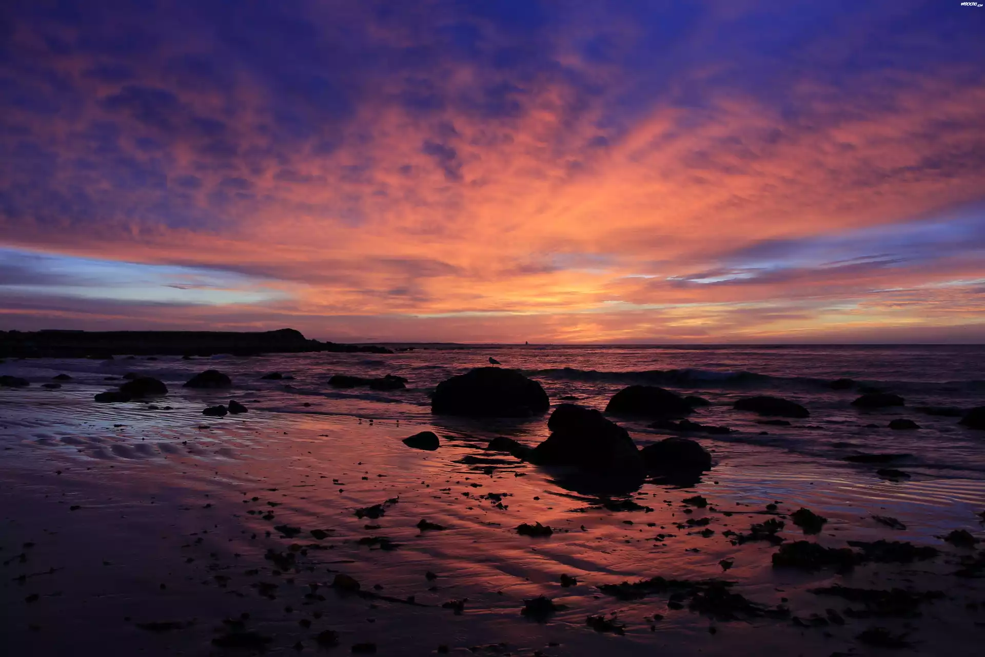 Morze, Niebo, Zachód, Słońca, Kamienie