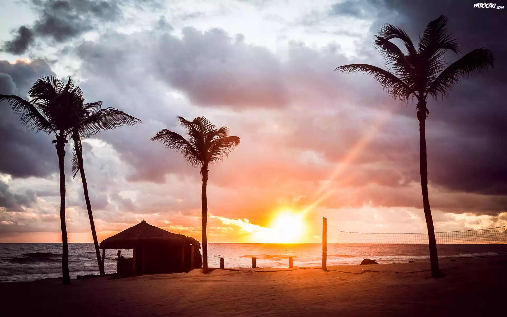 Morze, Palmy, Zachód słońca, Chmury