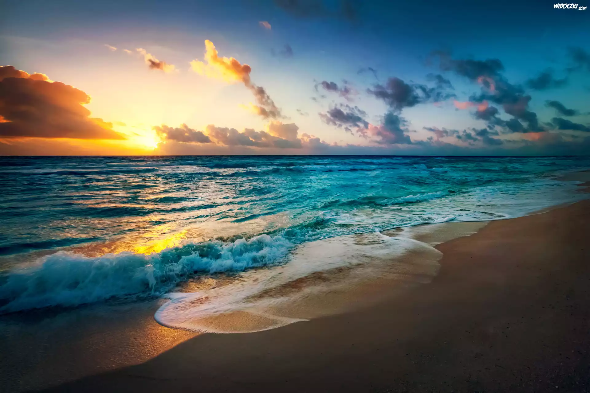 Zdjęcia, Morze, Plaża, Zachód Słońca, Chmury