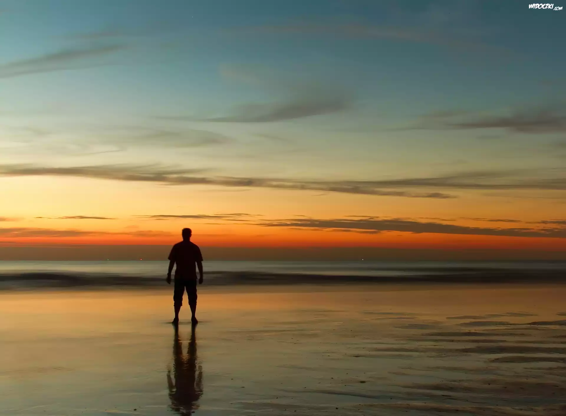 Morze, Plaża, Zachód, Słońca, Człowiek