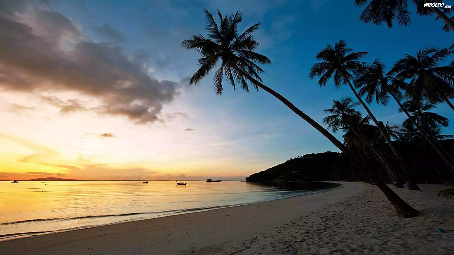 Zdjęcia, Morze, Plaża, Zachód, Słońca, Palmy