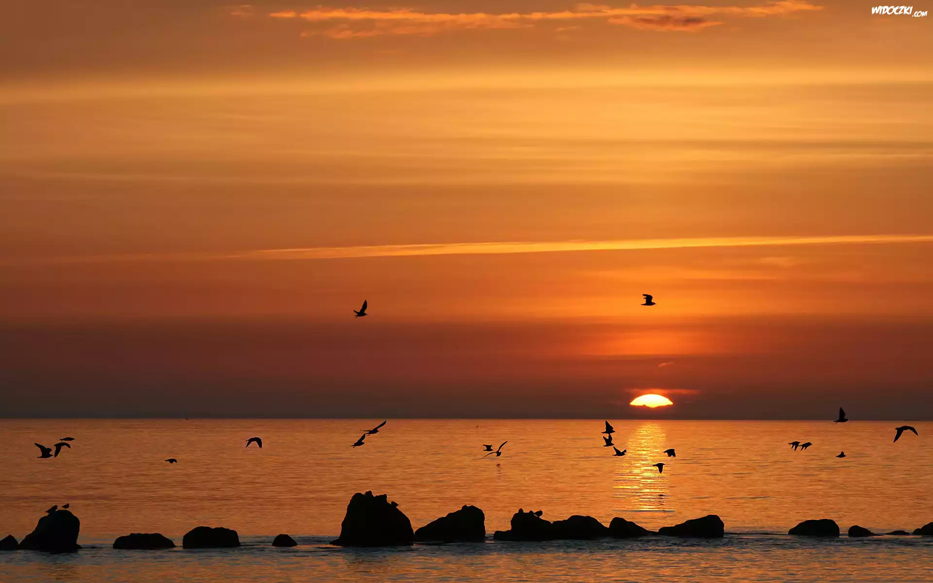 Zdjęcia, Morze, Zachód, Słońca, Ptaki