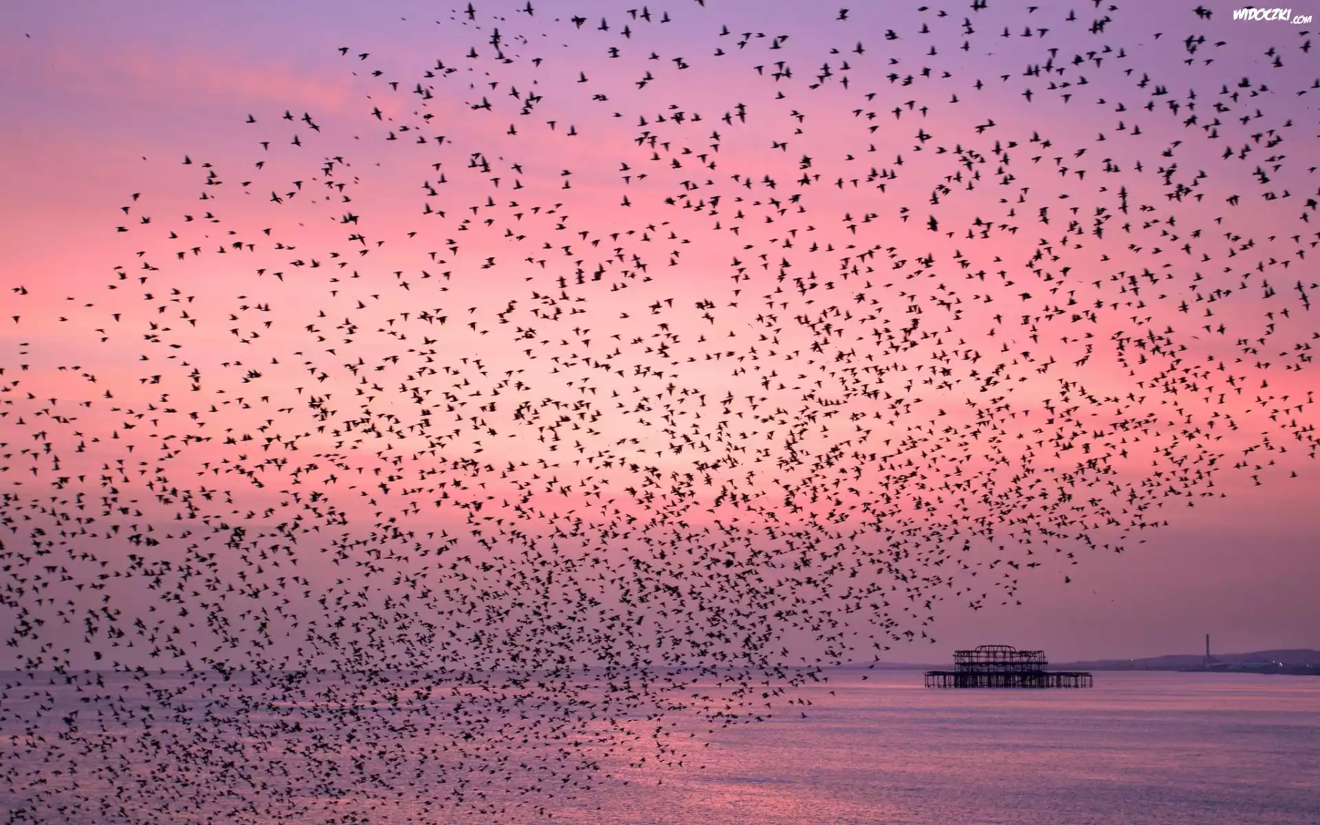 Zdjęcia, Morze, Ptaki, Zachód, Słońca, Niebo