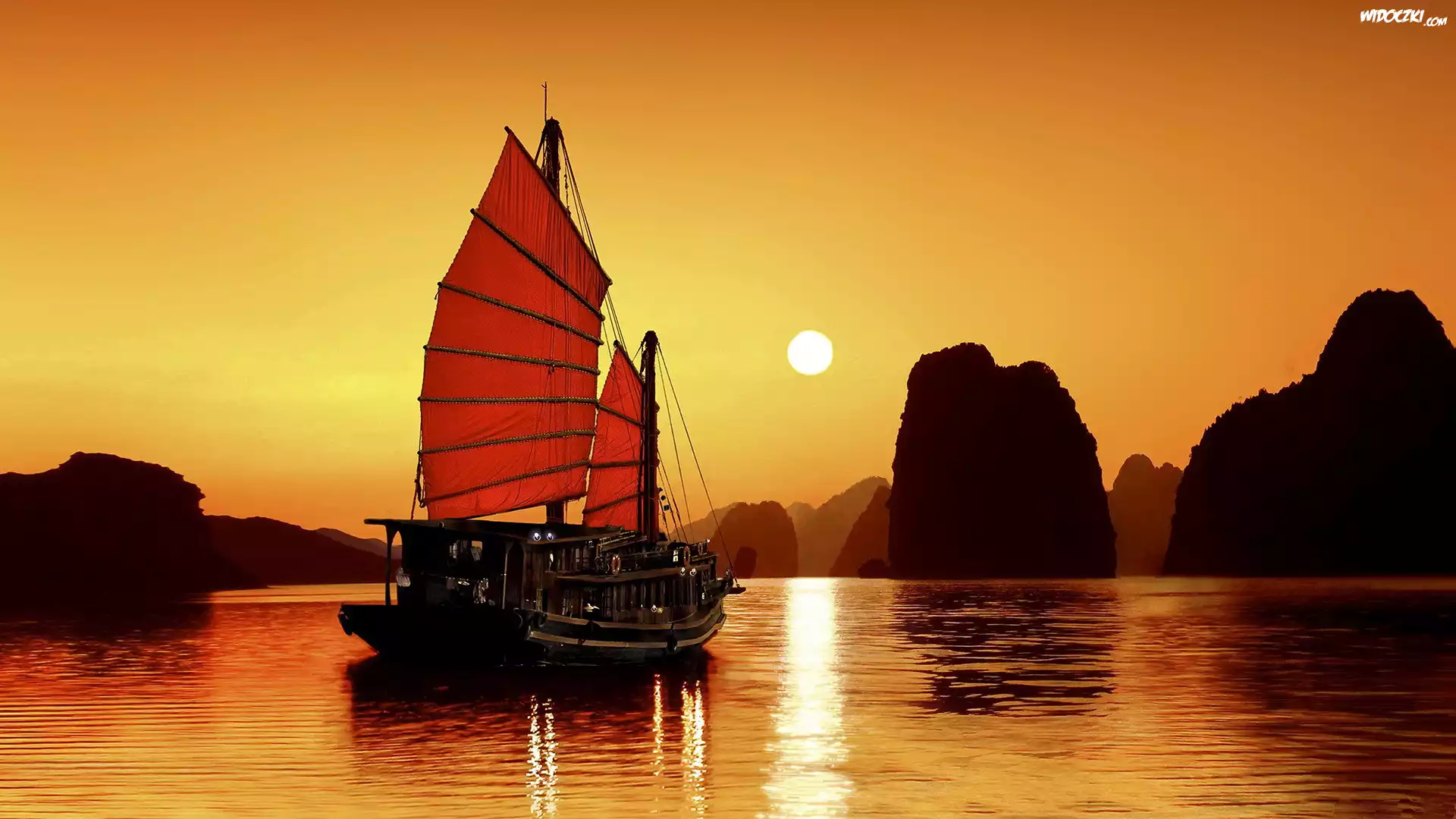 Zdjęcia, Morze, Skały, Zachód, Słońca, Żaglowiec