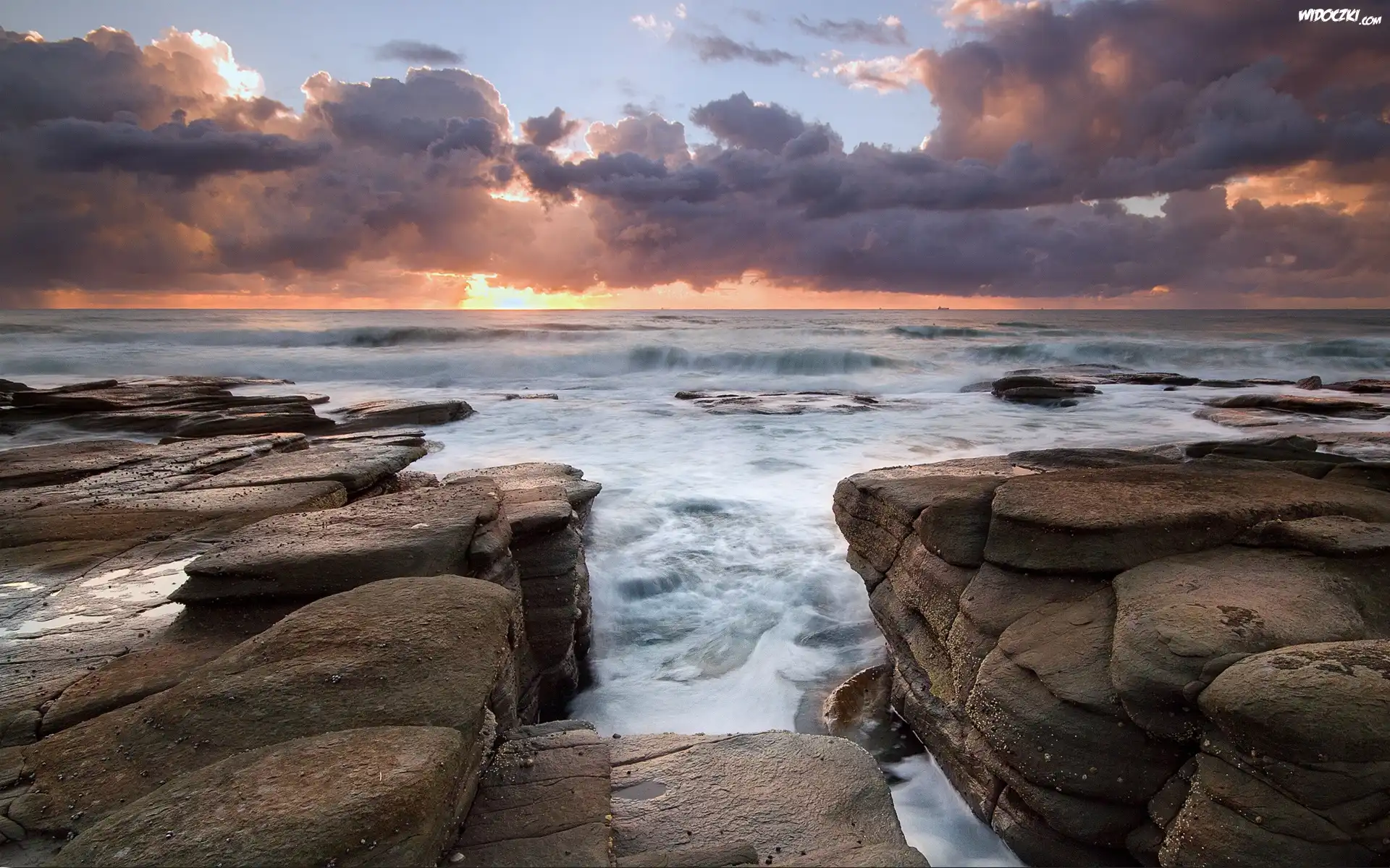 Zdjęcia, Morze, Skały, Zachód, Słońca, Chmury
