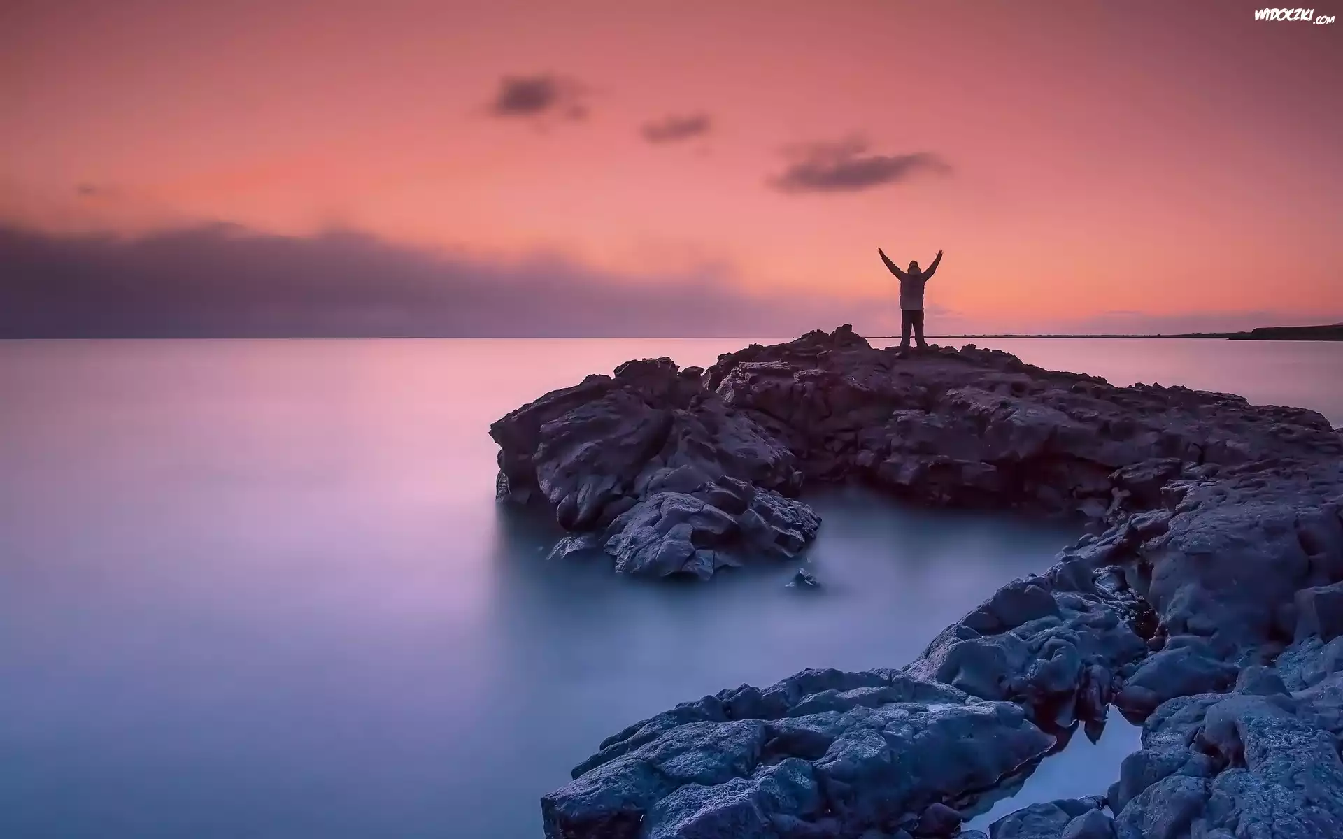Morze, Skały, Zachód Słońca, Człowiek
