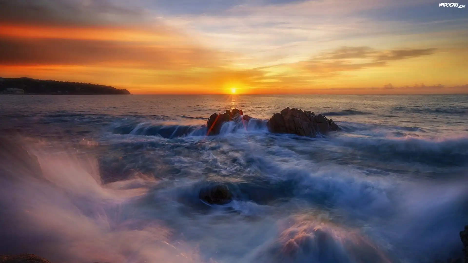 Morze, Skały, Zachód słońca, Fale