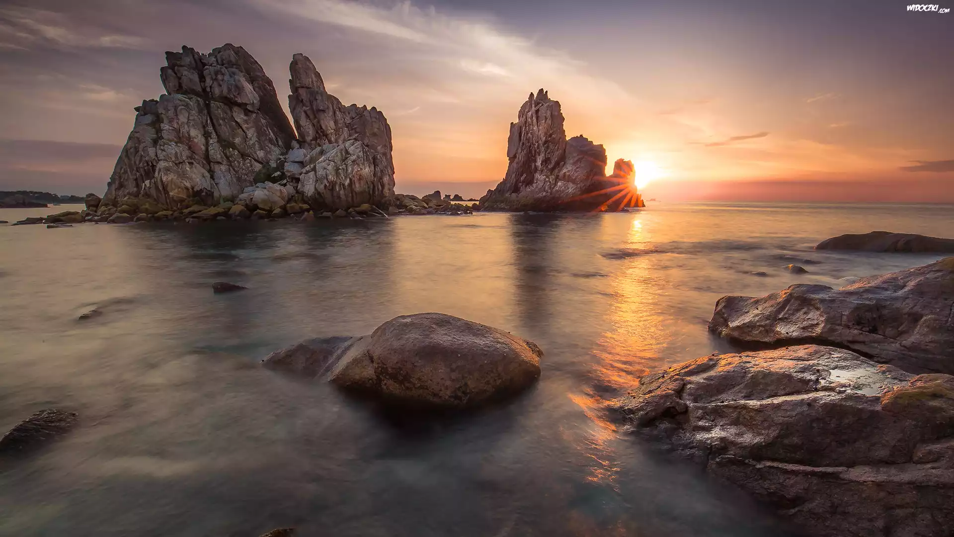 Morze, Skały, Zachód słońca, Promienie