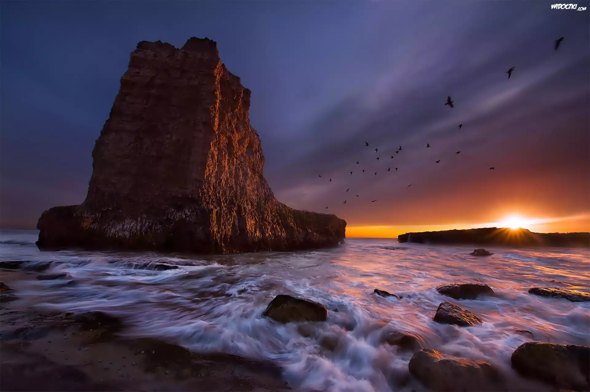 Zdjęcia, Morze, Skały, Zachód Słońca, Ptaki