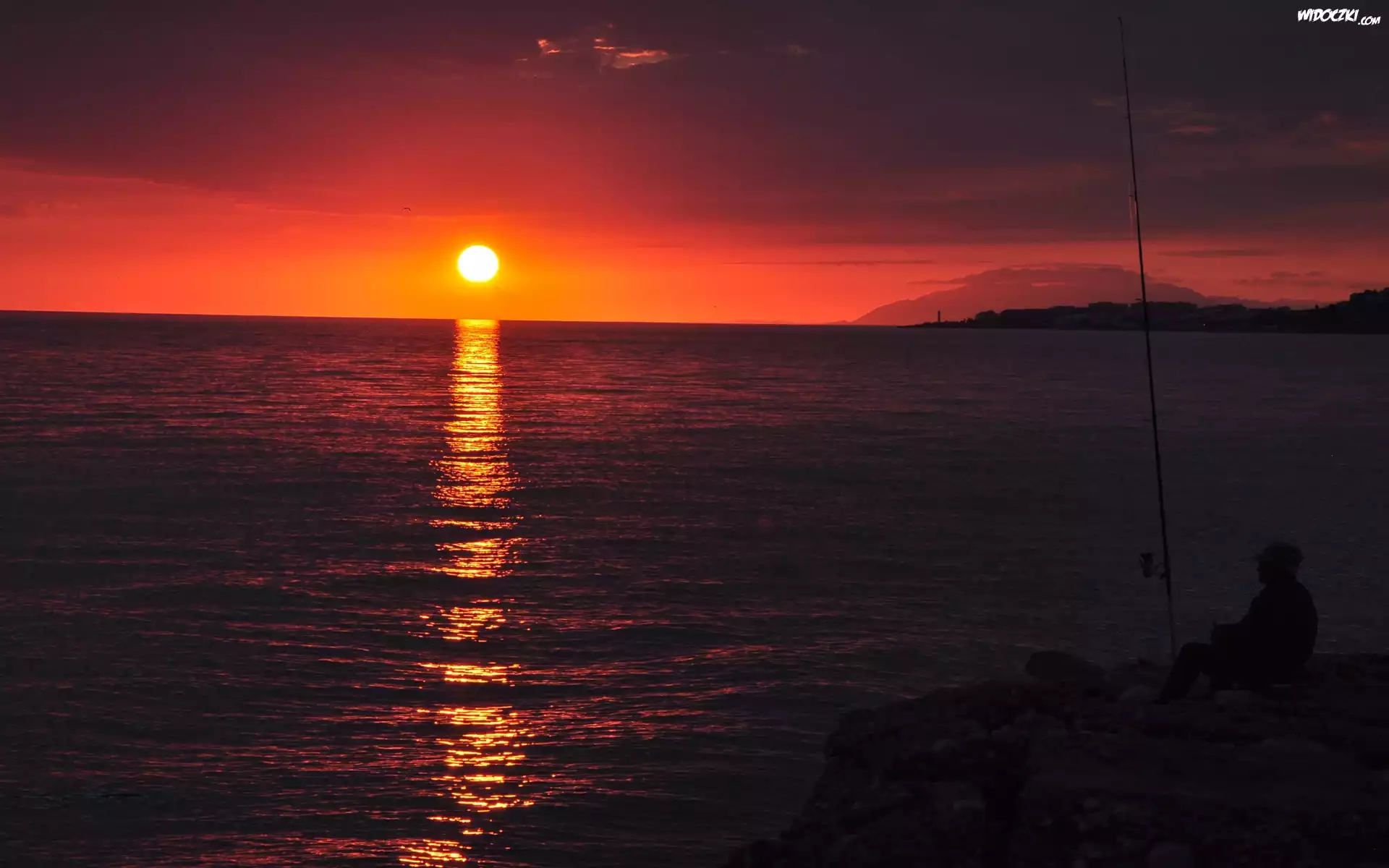 Zdjęcia, Morze, Zachód Słońca, Wędkarz