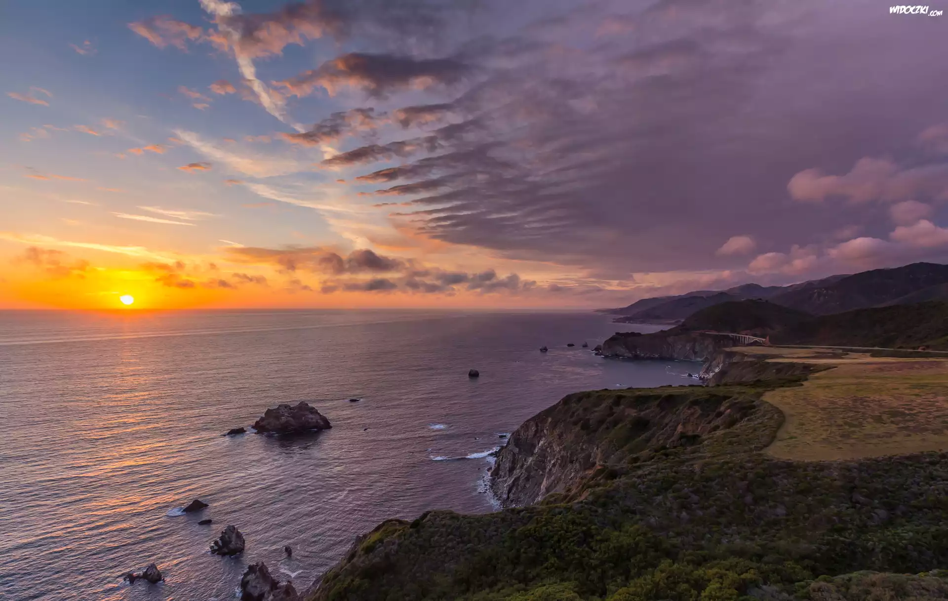 Zdjęcia, Morze, Wybrzeże, Zachód słońca, Most