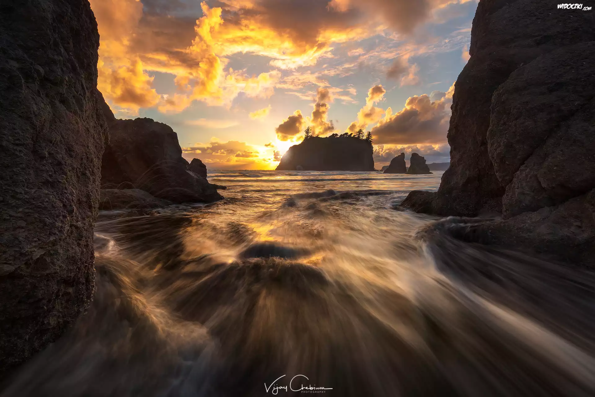 Morze, Skały, Chmury, Wschód słońca, Park Narodowy Olympic, Plaża Ruby Beach, Stan Waszyngton, Stany Zjednoczone |