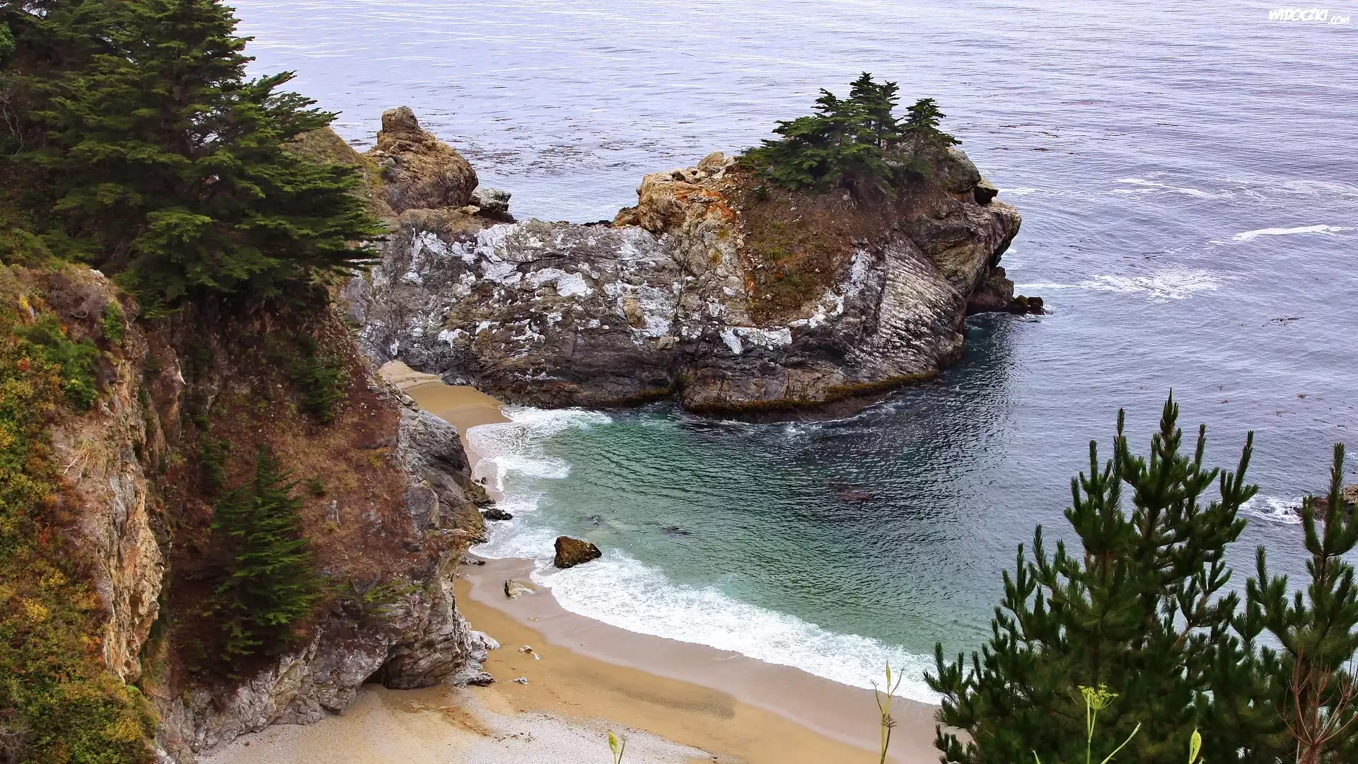 Morze, Skały, Plaża, Drzewa, Sosny, Zatoka McWay Cove, Park stanowy Julii Pfeiffer Burns, Kalifornia, Stany Zjednoczone |
