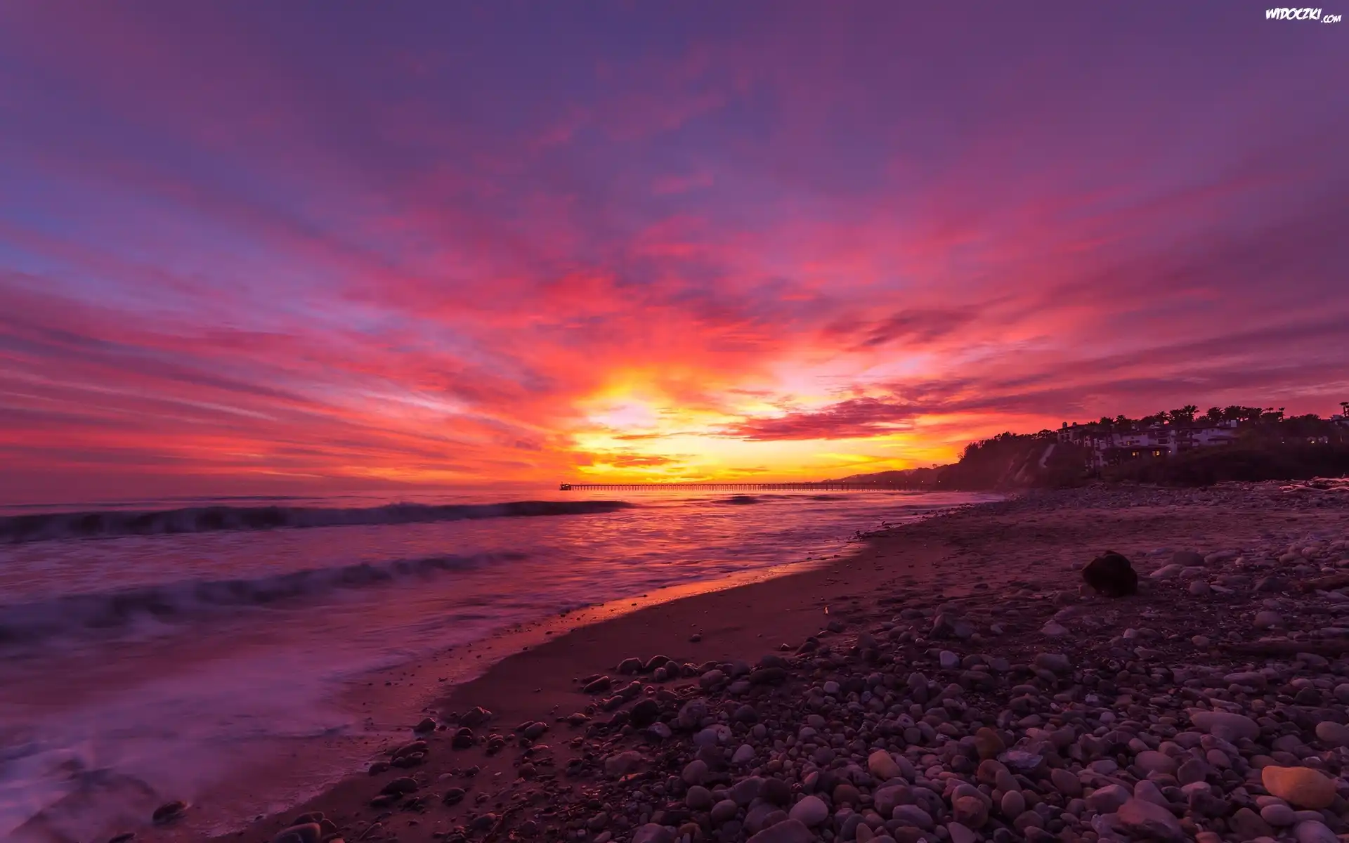 Morze, Plaża, El Capitan State Beach, Kamienie, Molo, Zachód słońca, Santa Barbara, Stan Kalifornia, Stany Zjednoczone |