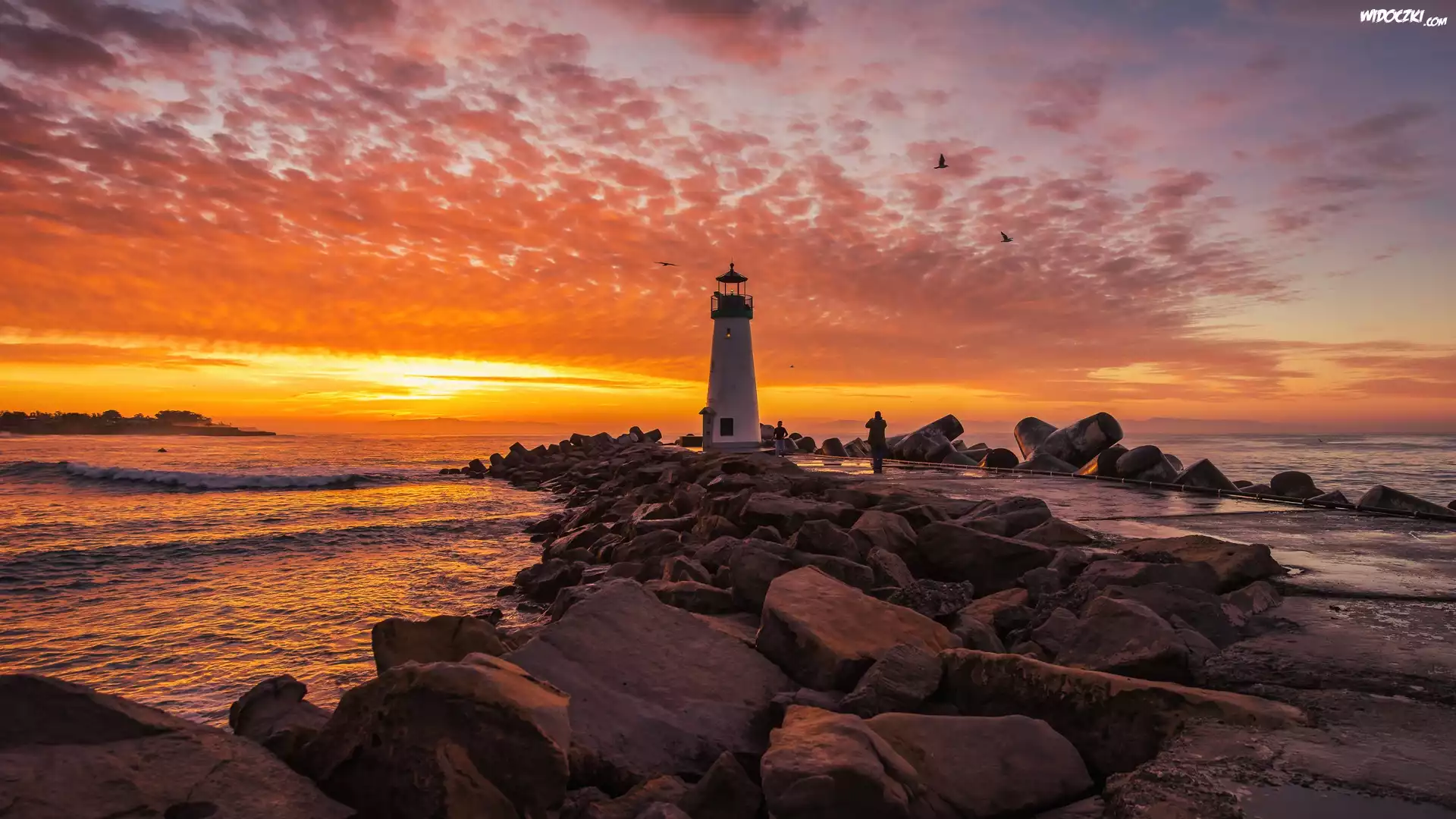 Morze, Kamienie, Zachód słońca, Chmury, Latarnia morska Walton Lighthouse, Santa Cruz, Stan Kalifornia, Stany Zjednoczone |