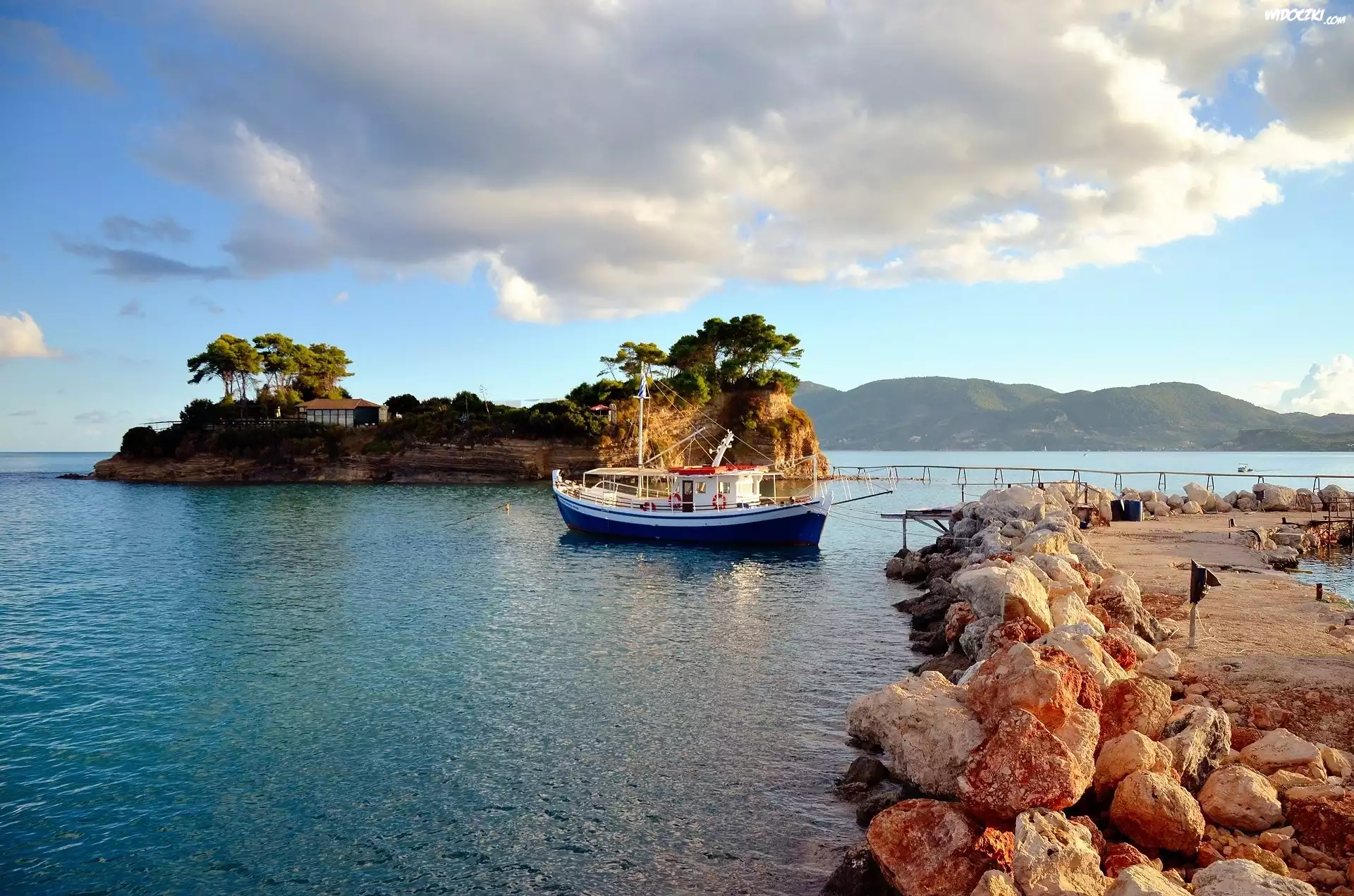 Zdjęcia, Morze, Wysepka, Statek, Grecja