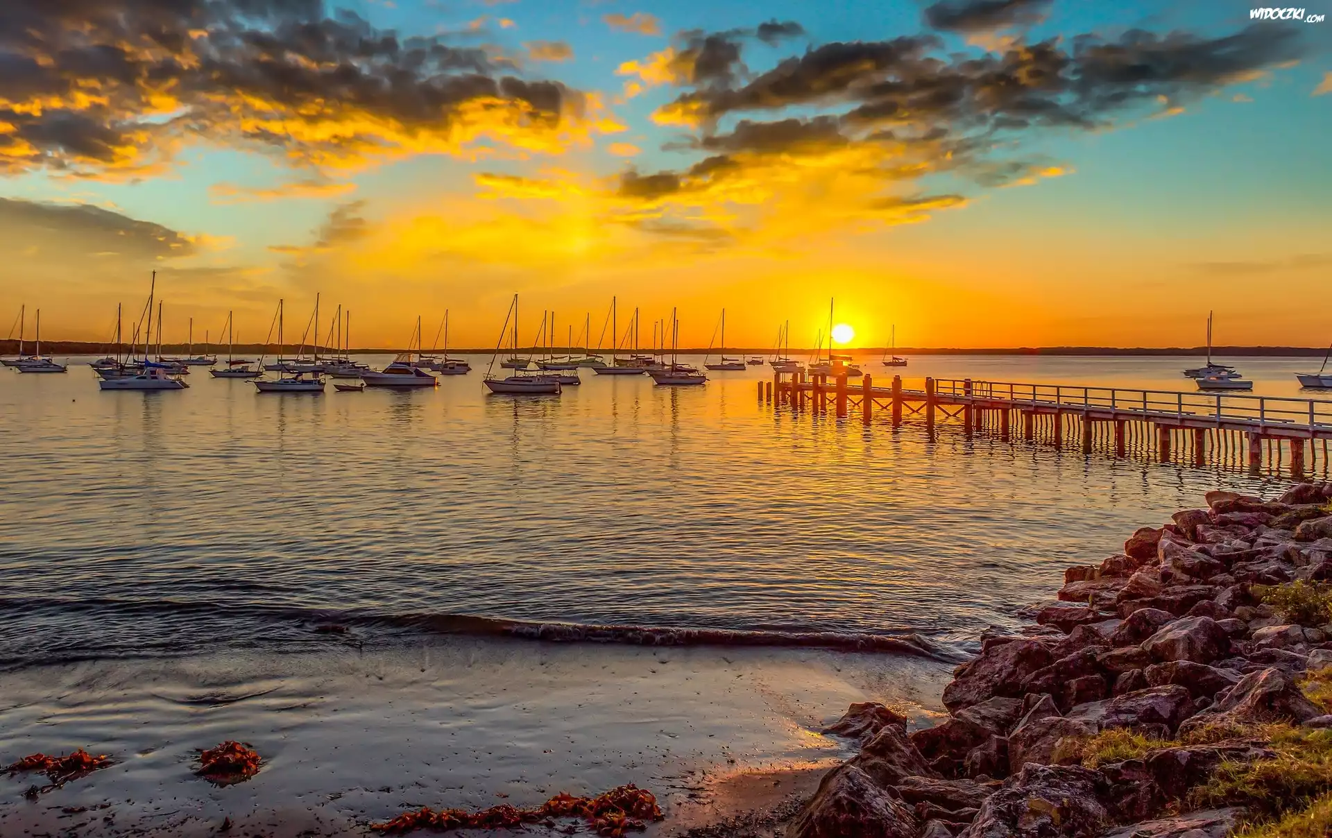 Zdjęcia, Morze, Kamienie, Zachód, Słońca, Statki, Pomost
