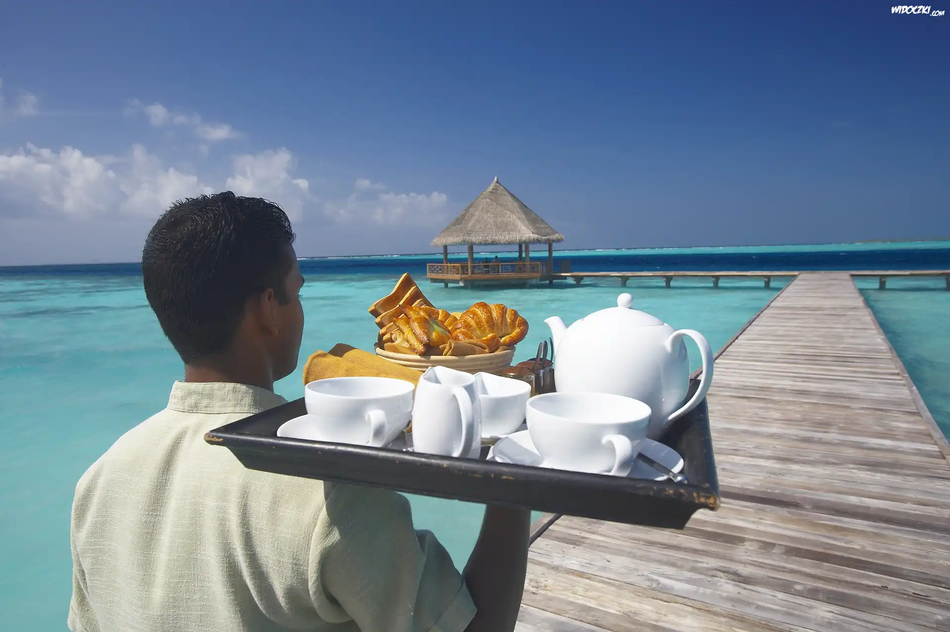 Morze, Molo, Mężczyzna, Taca, Filiżanki