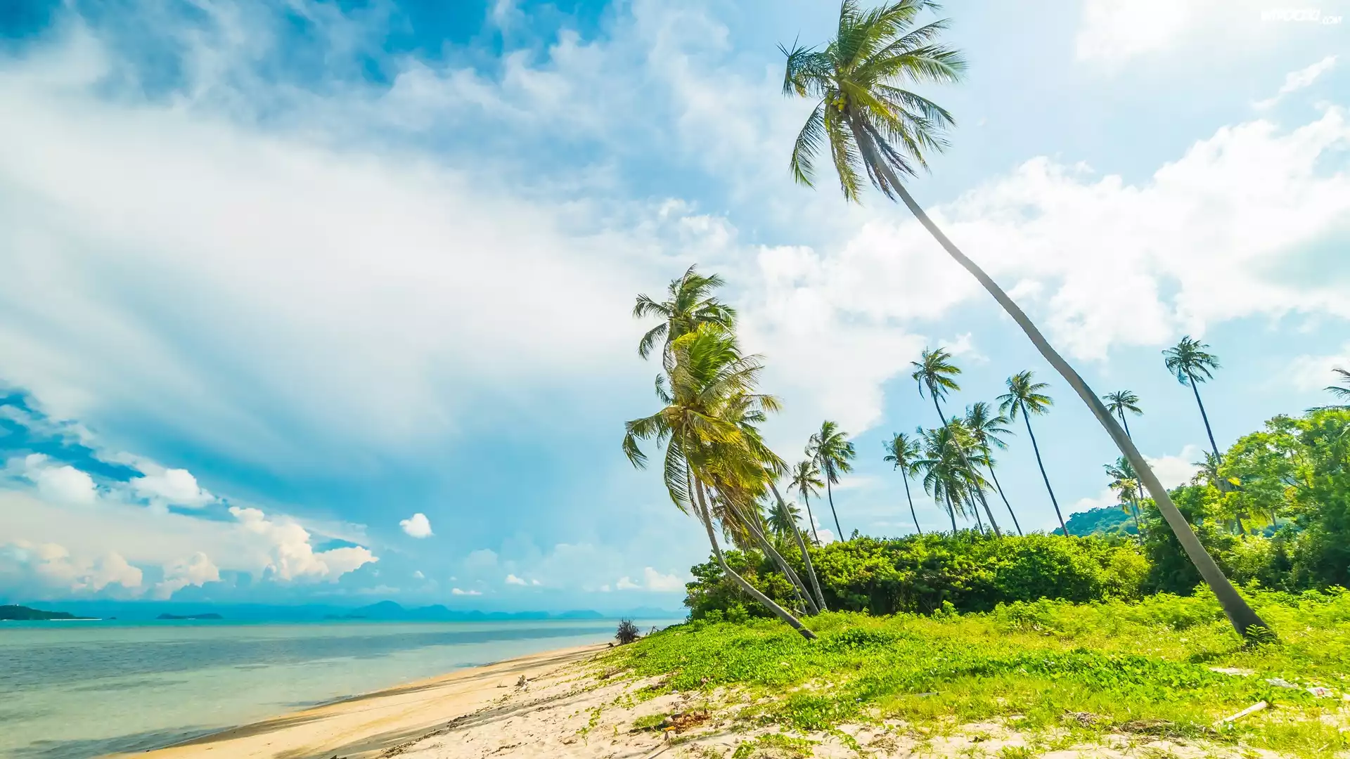 Zdjęcia, Morze, Palmy, Roślinność, Plaża, Tropiki, Chmury