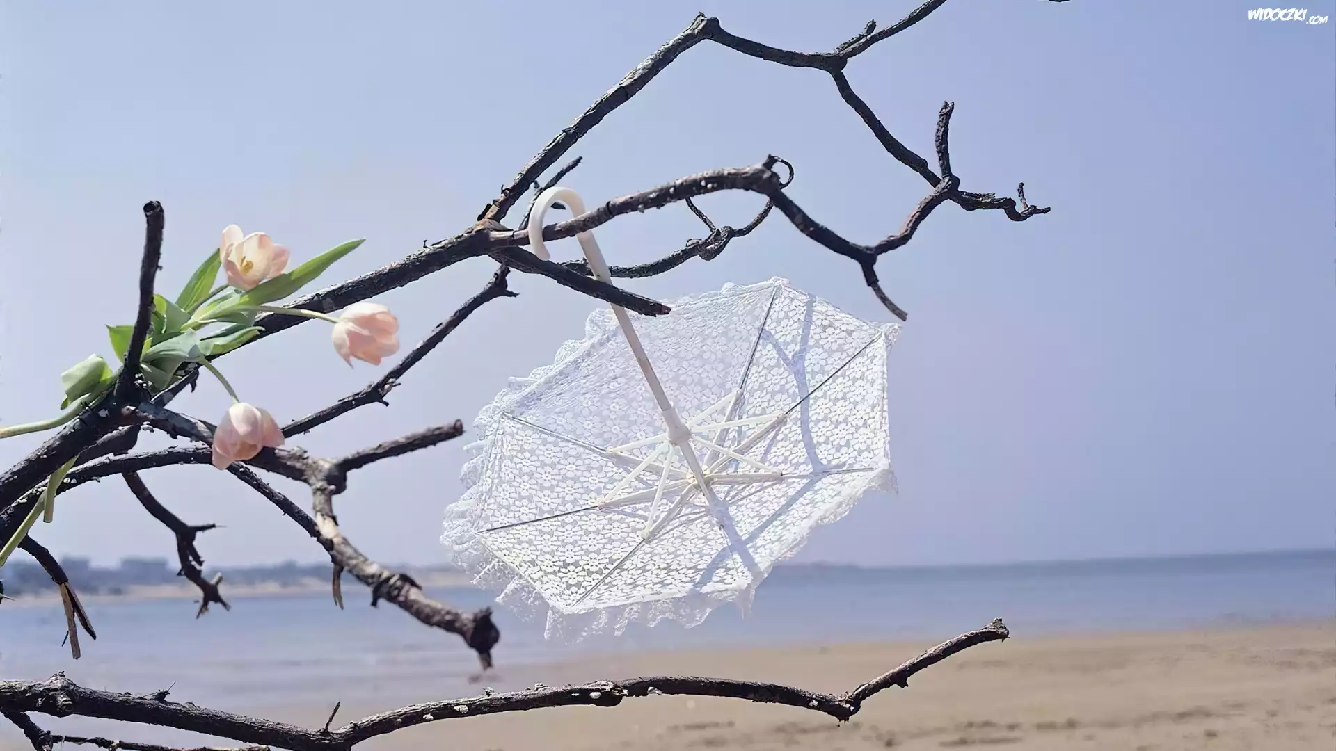 Morze, Konary, Tulipany, Parasolka
