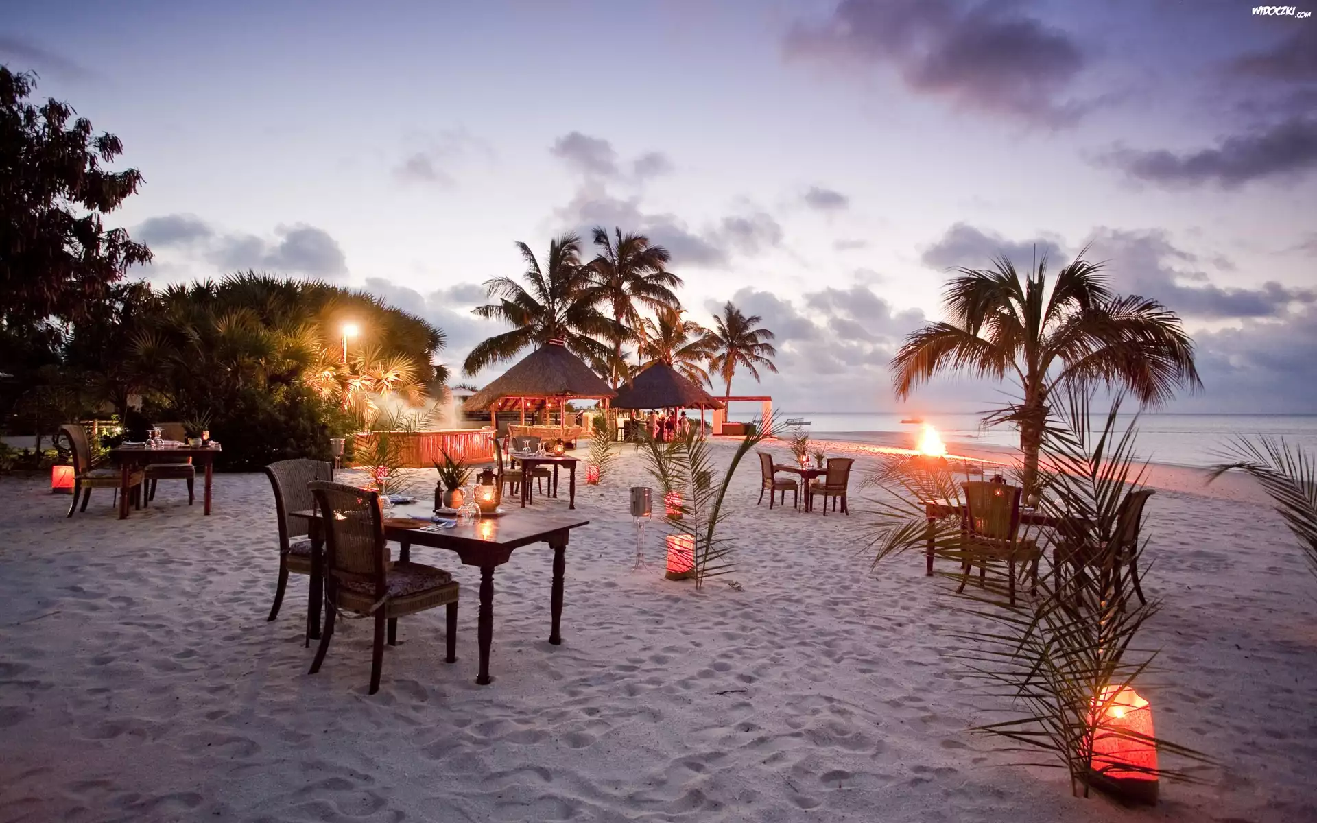 Zdjęcia, Plaża, Morze, Domki, Palmy, Stoliki, Lampiony, Tropiki, Wakacje