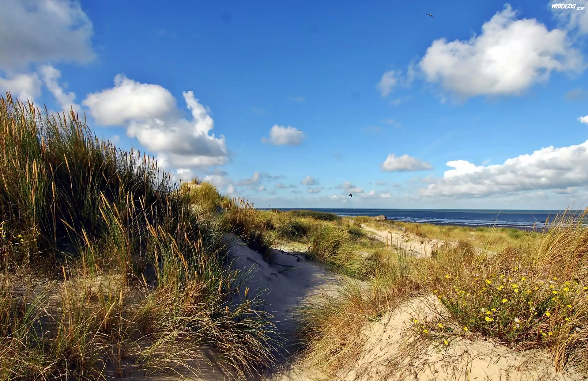 Morze, Wybrzeże, Wydmy, Trawy, Światło, Cień