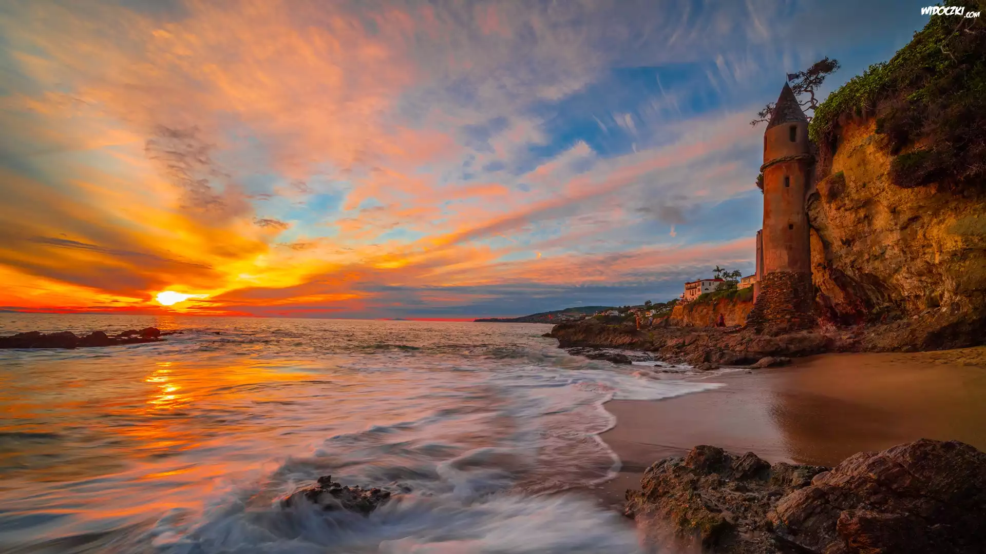 Morze, Victoria Beach, Wieża, La Tour, Klif, Skały, Zachód słońca, Kalifornia, Stany Zjednoczone