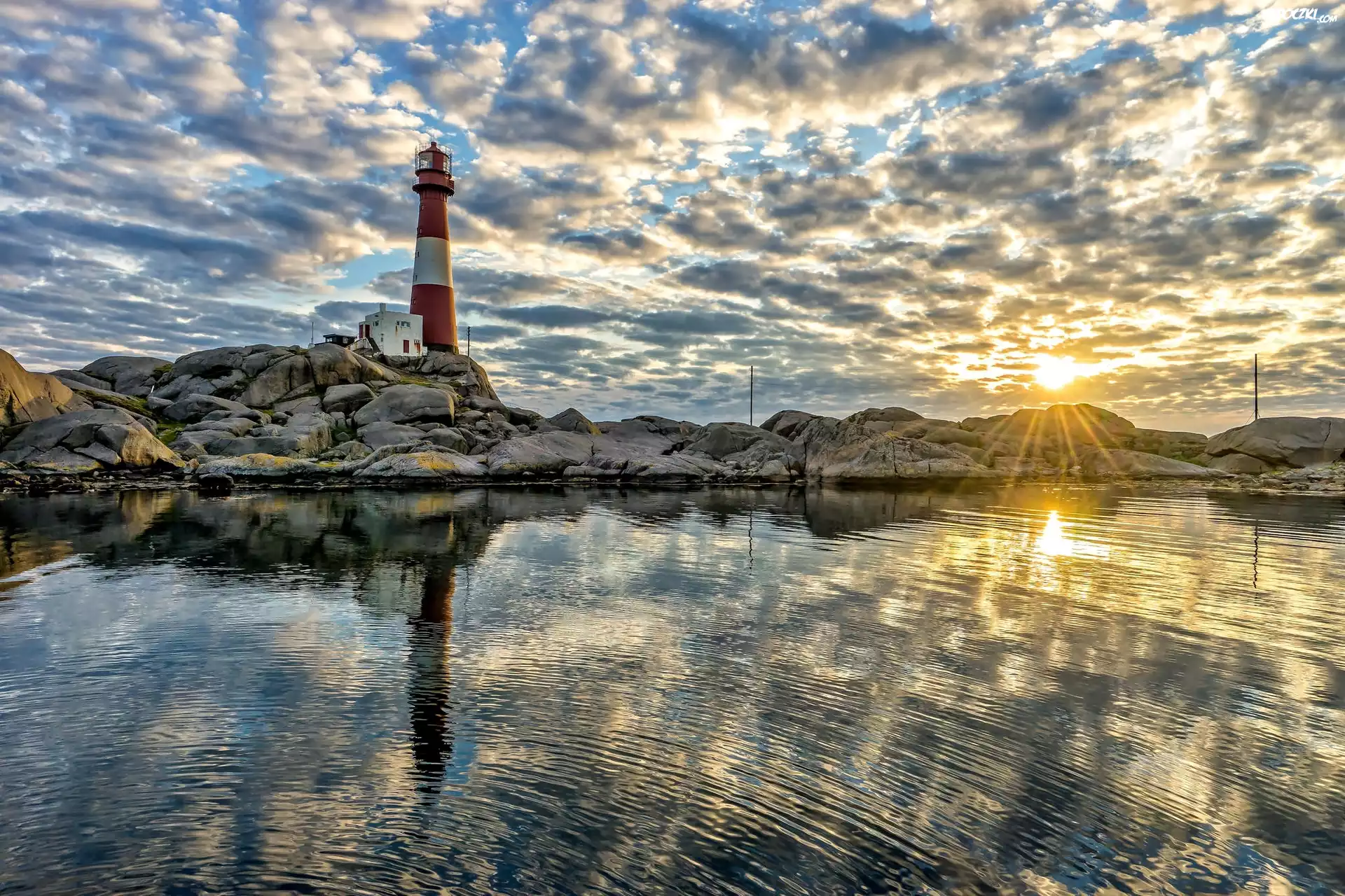 Zdjęcia, Morze, Wybrzeże, Chmury, Świt, Latarnia