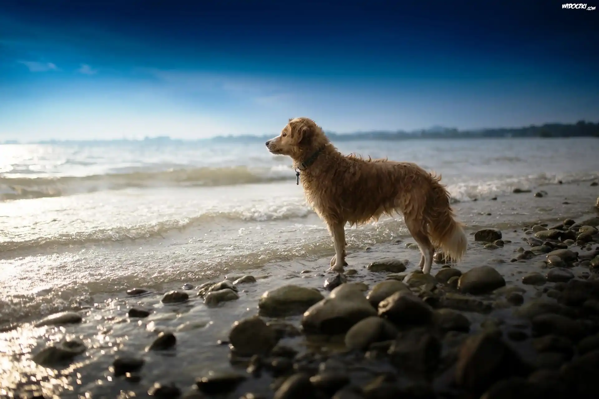 Morze, Kamienie, Fale, Pies, Åšwit, Oczekiwanie